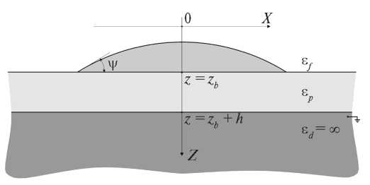 Введем следующие обозначения: ψ – угол смачивания; h – толщина пленки; εf, εp – диэлектрические проницаемости свободного пространства и пленки соответственно. Диэлектрическая проницаемость εd проводящей подложки считается бесконечной величиной. Выбор системы координат показан на рис. 1.