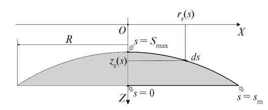 Найдем указанные гармонические функции. Сначала определим поверхность проводящей капли параметрическими функциями r = r (s) и z = z(s), где – расстояние от точки на поверхности капли с координатами (x, y, z) до оси Z; s – длина дуги образующей, отсчитываемой от точки капли на оси Z, ближайшей к пленке. Полную длину дуги образующей обозначим Smax (рис. 3).