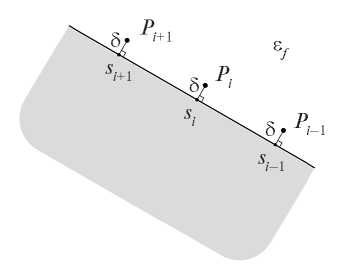 Рассмотрим на образующей капли N + 1 равномерно расположенные точки, соответствующие , где i = 1, 2, ..., N + 1. В i-й точке безразмерная плотность заряда равна значению , вычисляемому по формуле (9). В этой точке нормальная компонента электрического поля равна , что следует из граничных условий на поверхности проводника. Тогда потенциал в точке Pi, смещенной на малое расстояние δ по нормали к поверхности, приближенно равен потенциалу поверхности без δ( ), т.е. . С другой стороны, потенциал можно вычислить по формуле (10), учитывая, что . В итоге получаем следующие N + 1 уравнений в N + 1 точках коллокации Pi: