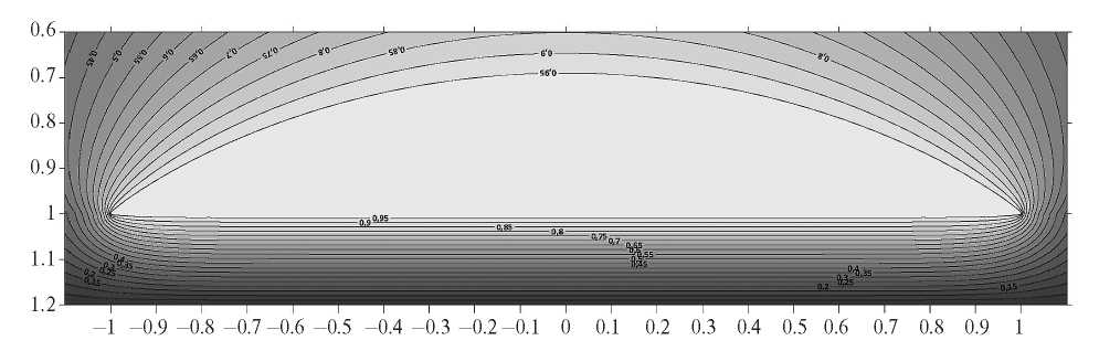 В качестве примера применения предложенного метода рассмотрена задача вычисления электрического поля от заряженной капли с единичным безразмерным радиусом линии смачивания. Капля находится в свободном пространстве с относительной проницаемостью εf = 1 и смачивает диэлектрическую пленку с проницаемостью εр = 4 и толщиной h∼ = 0.2. Угол смачивания ψ = 30 °. Показатель сингулярности β на линии смачивания найден из уравнения (4) и составляет β(ψ, εр /εf) =0.5174527. Общее количество гармонических функций, по которым производилось разложение потенциалов, равно N + 1 = 60. Смещение точек коллокации выбрано равным δ∼ = 0.0001. Между каплей и пленкой оставлялся зазор с εf = 1, равный δ∼, чтобы точки коллокации не попадали внутрь пленки. Результат расчета полного безразмерного потенциала представлен на рис. 5.