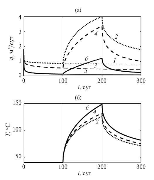 Рис. 1. Динамика величин притока жидкости (а) и температуры(б) в скважине при km =10 × 10–15 м2, δo = 1.0 × 10–4 1/К, ∆P = 10 МПа, Ng = 0 кВт (1, 3, 5) и Ng = 100 (2, 4, 6): 1, 2 – Gi = 0.001 МПа/м; 3, 4 –0.1; 5, 6 –1.