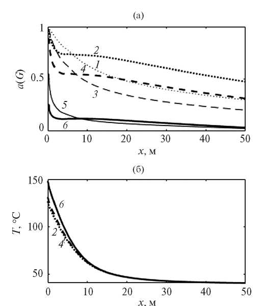 Распределение коэффициента a(G), характеризующее проявление нелинейной фильтрации, и температуры в пласте для различных значений предельного градиента давления приведены на рис. 2. При «холодной» добыче жидкости (кривые 1,3,5 на рис. 2а) отмечается монотонное снижение коэффициента a(G), которое на расстоянии 50 м от скважины при Gi = 0.05МПа/м составляет ~3.28 раза (кривая1), при Gi = 0.1 – 4.80 раза (кривая 3), при Gi = 1.0 – 20.67 раза (кривая 5). Коэффициент a(G) при добыче с включенным генератором ВЧЭМ-волн уменьшается слабее, поскольку прогревается околоскважинная зона (кривые 2, 4, 6, рис. 2б). Рост температуры в пласте сопровождается снижением вязкости пластовой жидкости и, соответственно, увеличением эффективной подвижности жидкости в пласте (km/µo)a(G). При Gi = 0.05 МПа/м a(G) уменьшается в ~2.0 раза (кривая 2, рис. 2а), при Gi = = 0.1 – 2.8 раза (кривая 4), при Gi = 1.0 – 7.2 раза (кривая 6). В области 2–5 м от скважины наблюдается перегиб в распределении a(G), который также проявляется на кривых распределения давлений и градиентов давлений в пласте (рис. 3).