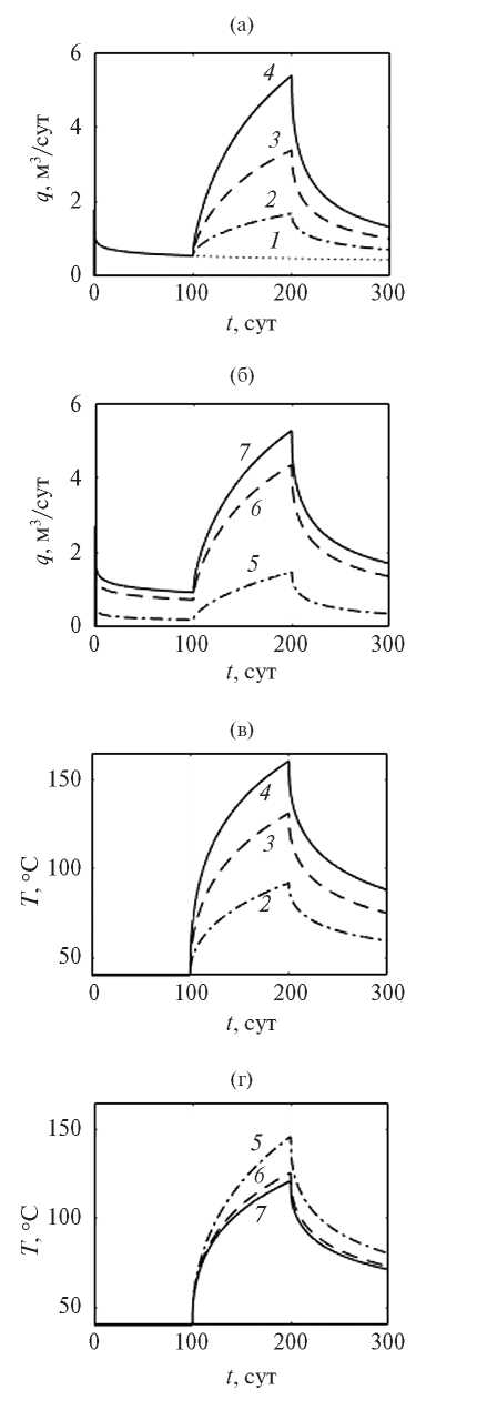 Перепад давления между скважиной и пластом также влияет на кратность интенсивности величины притока в конце первого и второго этапов. При наименьшем перепаде давлений ∆P = 5МПа (кривая 5, рис. 4б) кратность q составляет ~7.3 раза, а при больших перепадах давлений кратность меньше: при ∆P = 7.5 МПа ~5.9 раза (кривая 6), при ∆P = 15~5.6 раза (кривая 7). Это обусловливается тем, что при меньших перепадах давления в околоскважинной зоне достигаются более высокие температуры: при ∆P = 5 МПа – до 145.9 °С (кривая 5, рис. 4г), при ∆P = 7.5– до 125.5 °С (кривая 6), при ∆P = 15 – до 120.8 °С (кривая 7). В конце третьего этапа также величина притока интенсивнее в ~1.8 раза и температура выше первоначальной на 30–40 °С.