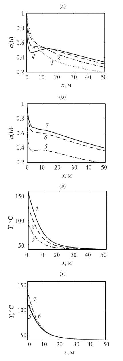 Из рис. 5 видно, что при возрастании мощности генератора ВЧЭМ-волн характер изменения коэффициента a(G) неодинаковый. При тепловом воздействии мощностью =150 кВт (кривая 4, рис. 5а) коэффициент a(G) уменьшается слабее (изменяется в интервале от ~0.34 при x = 50 м до ~0.80 в околоскважинной области), чем в случае «холодной» добычи (от ~0.20 до ~0.97, кривая 1) и воздействии с меньшей мощностью = 50 (от ~0.27 до ~0.94, кривая 2) и = 100 (a(G) от ~0.31 до ~0.88, кривая 3). Увеличение перепада давления между скважиной и пластом также сопровождается большими значениями a(G) и меньшими абсолютными значениями температуры в околоскважинной области (рис. 5б, 5г). Также и на рис. 3 кривые распределения a(G) имеют немонотонный вид. Видно, что этот эффект с распределением a(G) на расстояниях до ~10 м усиливается с увеличением градиента температуры в ближней зоне пласта. Соответственно, чем больше мощность генератора ВЧЭМ-волн и меньше перепад давления между скважиной и пластом, тем более немонотонное распределение a(G) в ближней зоне пласта.