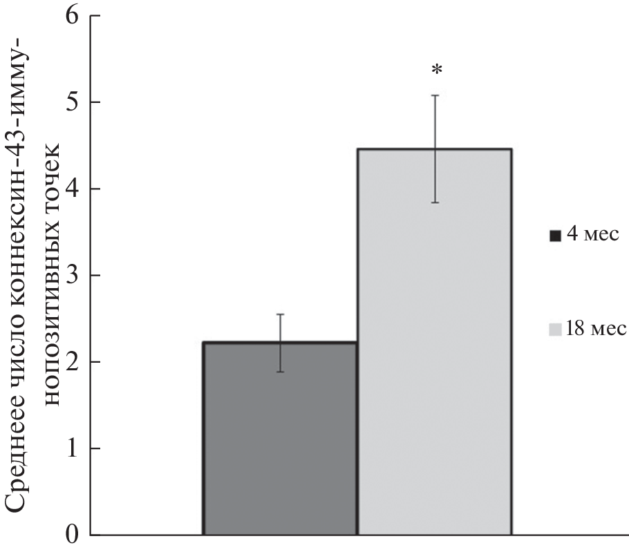 The aim of this study was to assess the dynamics of distribution and localization of the gap junction protein connexin-43 (Cx43) in rat dorsal root ganglion (DRG) cells at different stages of postnatal ontogenesis to assess the morphological signs of age-related changes in intercellular interactions. The work was performed on Wistar rats at the age of 4 months and 18 months using immunohistochemical methods. Glial cells were detected using antibodies to glutamine synthetase, macrophages – using the antibodies to calcium-binding protein Iba-1. The paper describes the features of connexin-43 distribution in the spinal ganglion of young and old rats. It has been established that connexin-43-containing structures are identified mainly in satellite glial cells of young and aging animals. Sensitive neurons, as well as DRG macrophages of both groups of animals, do not show immunoreactivity. Analysis of age-related changes in intercellular contacts in rat DRG showed that plaques of connexin-43-containing protein channels that provide metabolic interaction of satellite cells in the spinal ganglia become more numerous with age. This fact may indicate the activation of the interaction between glial cells in the DRG of rats during aging.