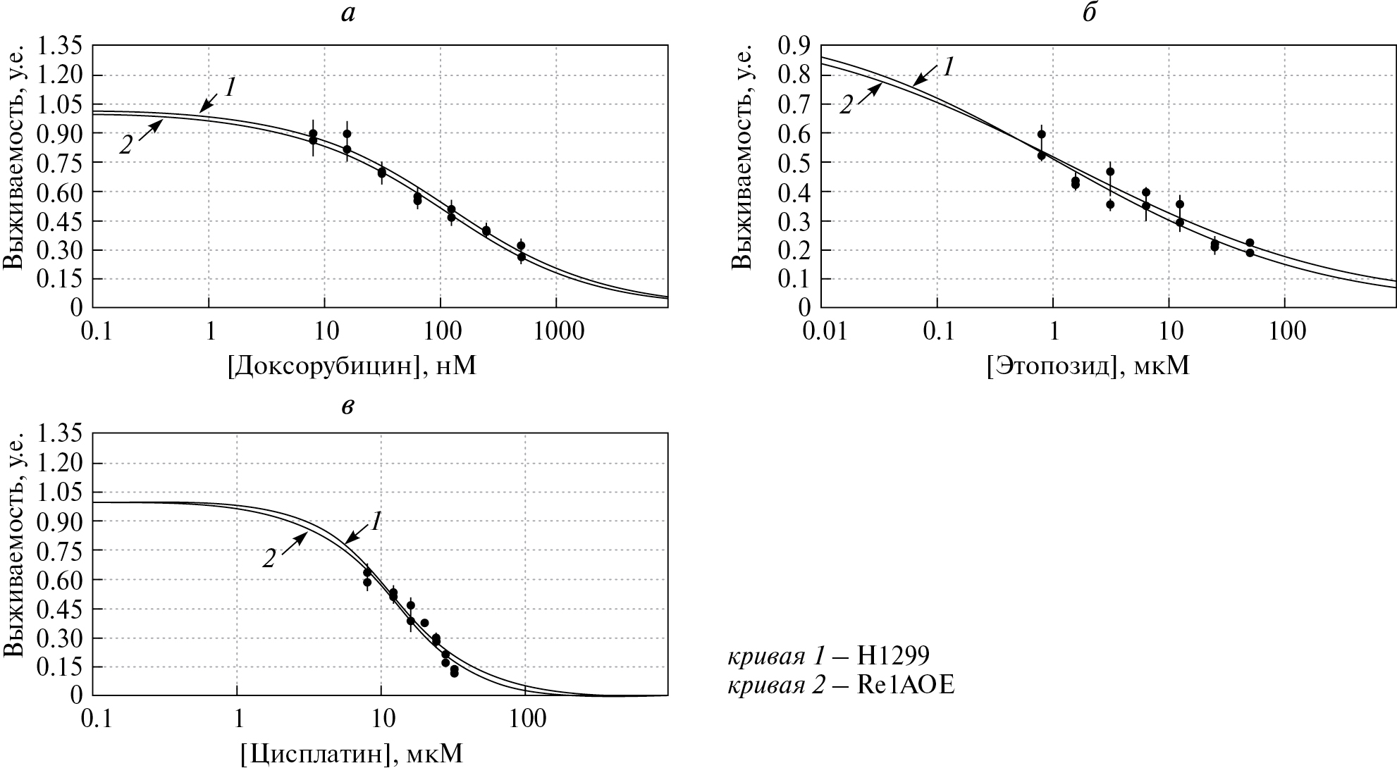 Рис. 3. Относительная устойчивость клеток линий H1299 (кривая 1) и H1299 RelAOE (кривая 2) к действию доксорубицина (а), этопозида (б) и цисплатина (в). Цитотоксичность (МТТ-тест) оценивали после обработки клеток в течение 72 ч. Для каждого вещества строили кривую зависимости доза–эффект при помощи модели логистической регрессии. Вертикальные отрезки — ошибки среднего значения