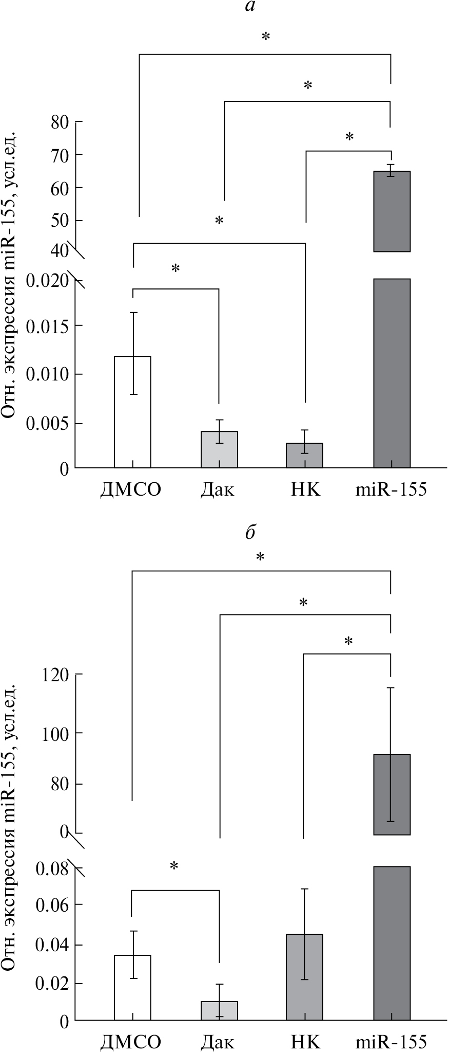 Рис. 1. Уровни экспрессии микроРНК miR-155 в клетках меланомы В16 после действия 0.1% ДМСО, 1.2 мМ дакарабазина, дакарбазина с последующей трансфекцией негативного контроля имитатора miR-155, дакарабазина с последующей трансфекцией миметика микроРНК miR-155 до окислительного стресса (а) и через 24 ч после добавлении 700 мкМ Н2О2 (б). По результатам ПЦР-РВ; (*) — различия достоверны при Р = 0.0495 (критерий Краскелла–Уоллеса)