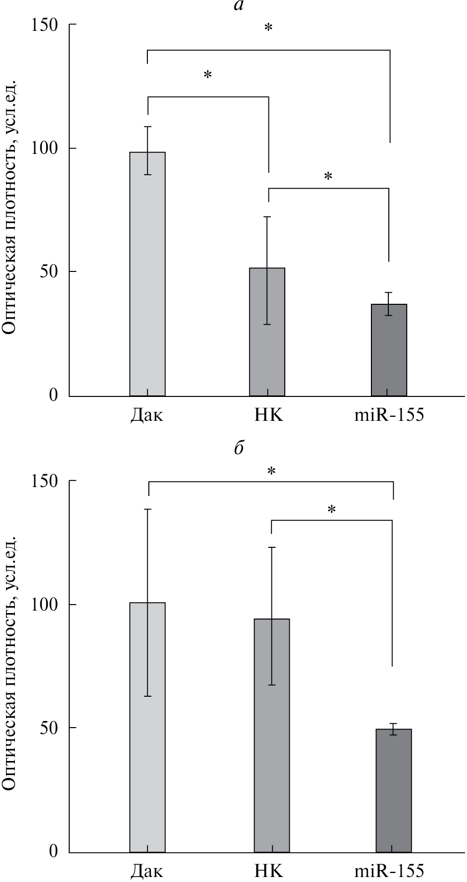 МТТ-тест. Для оценки метаболической активности (жизнеспособности) клеток после воздействия миметиком микроРНК miR-155 выполняли МТТ-тест. Питательную среду отбирали из лунок, заменяли ее на свежую полную среду с МТТ (5 мг МТТ на 1 мл полной питательной среды) (Invitrogen, Thermo Fisher Scientific Inc., Нидерланды). В каждую лунку добавляли по 135 мкл полной питальной среды и по 15 мкл концентрата МТТ. Далее клетки культивировали в условиях СО2-инкубатора в течение 4 ч. Затем отбирали жидкость из лунок, добавляли 200 мкл ДМСО и культивировали еще 10 мин. Оптическую плотность раствора в лунках определяли на спектрофотометре “Эфос-9305” (“Фотосистемы Швабе”, Россия) при длине волны 594 нм.