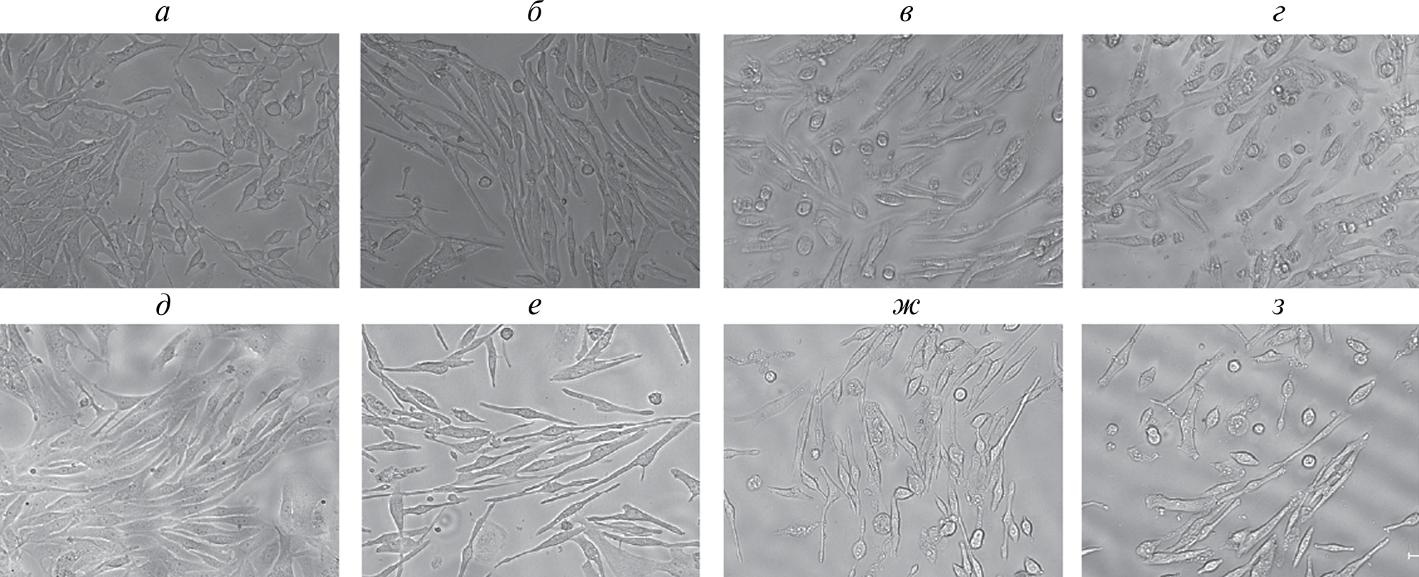 Клетки культивировали в среде DMEM (“ПанЭко”; Москва, Россия), содержащей 10% эмбриональной телячьей сыворотки (FBS) (HyClone, GmbH, Parsching, Австрия), 1% антибиотика/антимикотика (Gibco Life Technologies; Гранд-Айленд, США). Клетки культивировали в инкубаторе при 37 °С в атсмосфере 5% СО2 (Sanyo MSO-5AC, Осака, Япония).