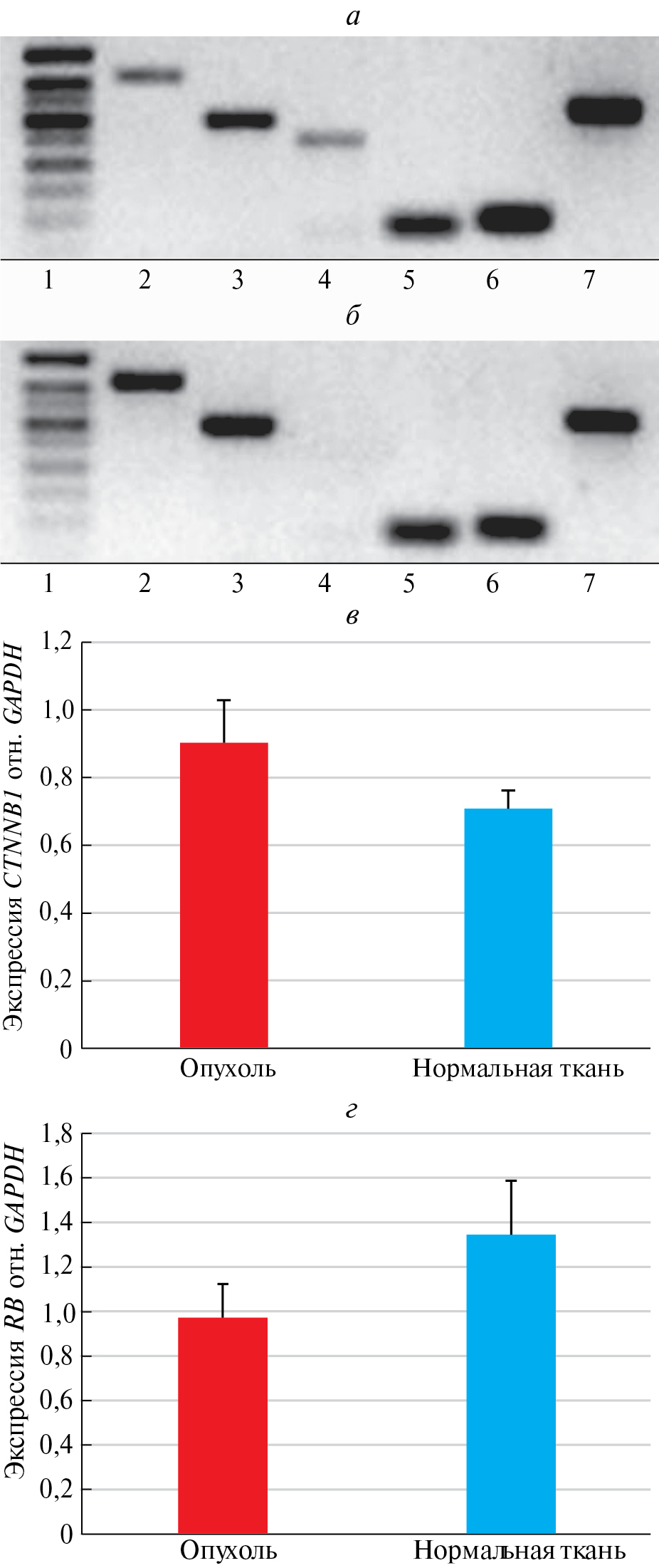 Рис. 1. Амплификация RB и CTNNB1 (ген β-катенина) в опухолевой и нормальной ткани предстательной железы (ПЖ) пациентов, оперированных по поводу РПЖ. ОТ-ПЦР-амплификация маркеров: эпителиальных (ЦК5, AR), опухолевого (AMACR), RB и CTNNB1 (гена β-катенина) в опухолевой (а) нормальной (б) ткани ПЖ: 1 – маркер мол. массы 50 п.о., 2 – ЦК5 (423 п.о.), 3 – AR (294 п.о.), 4 – AMACR (247 п.о.), 5 – RB (91 п.о.), 6 – CTNNB1 (101 п.о.), 7 – GAPDH (326 п.о.); в, г – ПЦР-РВ-амплификация RB и CTNNB1 соответственно; в, г – данные ПЦР-РВ представляют собой среднюю арифметическую величину и ее ошибку (n = 3)