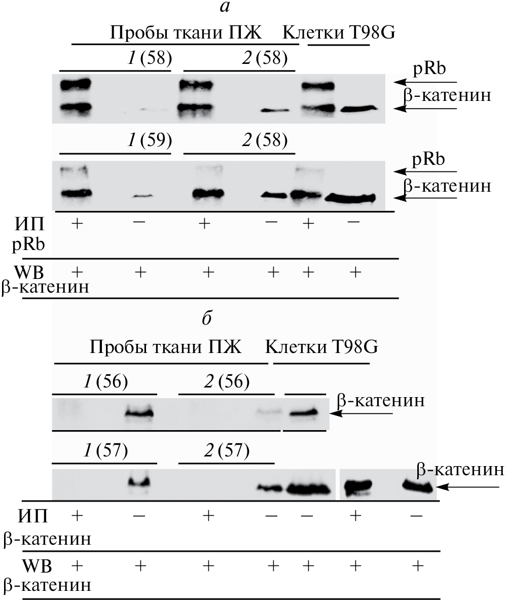 Рис. 3. Белки pRb и β-катенин физически взаимодействуют друг с другом и формируют комплекс в экстрактах ткани предстательной железы человека: а – β-катенин (клинические пробы 58 и 59) не преципитируется из экстрактов ткани ПЖ, но выявляется на иммуноблоте антителами CAT-15 (Thermo Fisher Scientific, США), распознающими эпитоп в С-концевом участке молекулы; б – антитела к pRb ко-иммунопреципитируют β-катенин из экстрактов ткани ПЖ (клинические пробы 56 и 57). Клетки T98G использовали как положительный контроль. ИП, WB – то же, что и на рис. 2. Показаны результаты для опухолевой (1) и нормальной (2) ткани ПЖ