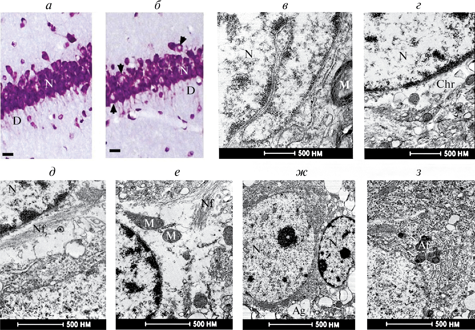 Рис. 1. Нейродегенеративные изменения клеток пирамидного слоя области СА1 дорсального гиппокампа у взрослых крыс, перенесших пГГЦ (б, г–з) в сравнении с контрольными (а, в); а, б — микрофотографии поля СА1 гиппокампа у крыс контрольных (а) и перенесших пГГЦ (б) крыс. Окраска по Нисслю, масштабная линейка: 30 мкм. Стрелками показаны пирамидные нейроны в состоянии хроматолиза; N — нейроны, D — дендриты. в–з — электроннограммы области СА1 гиппокампа крыс в контроле (в) и с пГГЦ (г–з); показаны хроматолиз (Chr, г), нейрофиламентозный тип клеточной дегенерации (д, е), выход нейрофиламентов в отросток нейрона (е), активация астроцитарной глии (ж) и аутофагосомы в цитоплазме нейрона (з). Ml — миелинизированные волокна, M — митохондрии, Nf — нейрофиламенты, Ag — отростки астроцитарной глии, Af — аутофагосомы