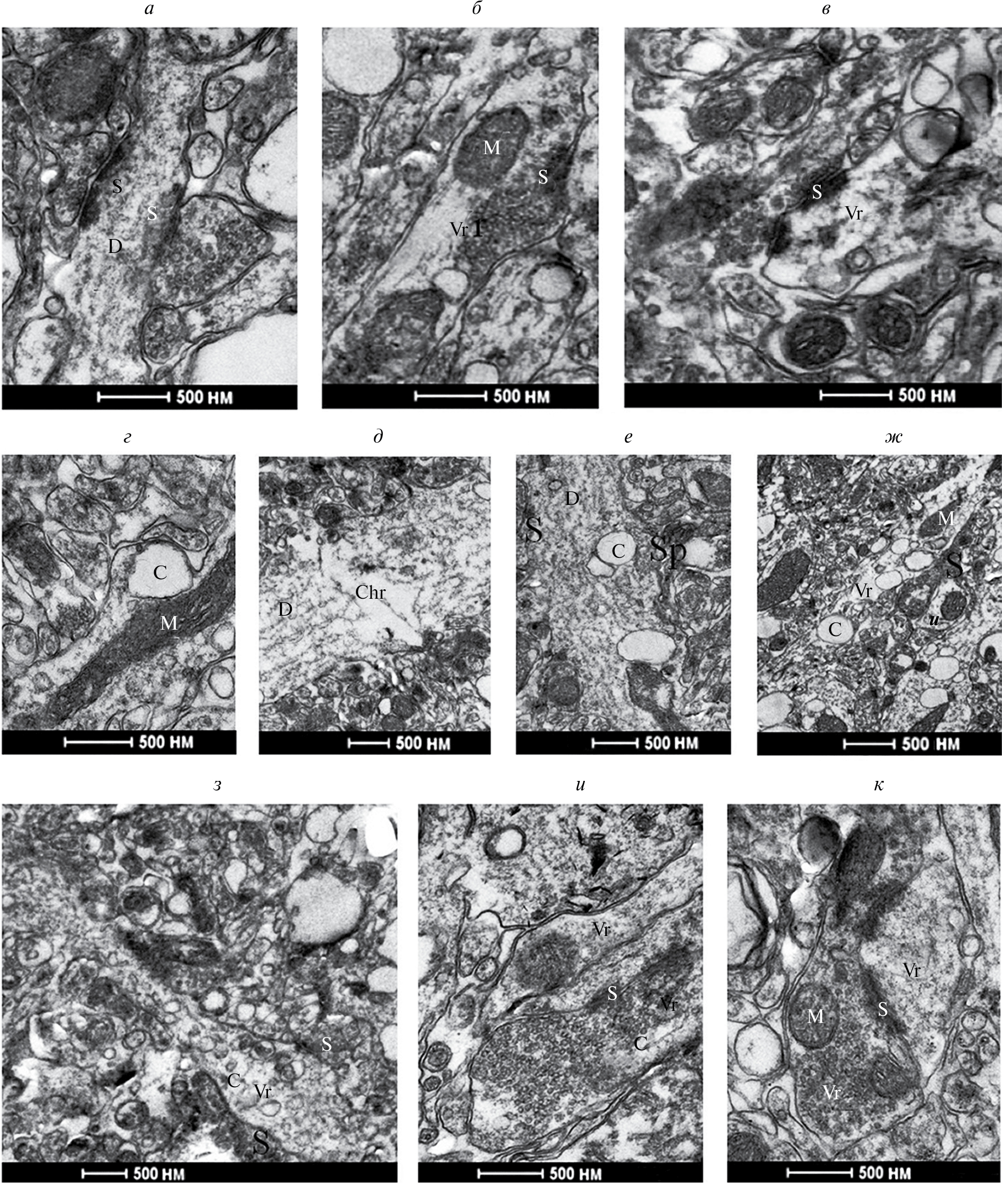 Рис. 2. Деструктивные изменения базальных дендритов области СА1 дорсального гиппокампа. Электроннограммы крыс контрольных (а–в) и с пГГЦ (г–к) в возрасте P90. С — цистерны, CHR — хроматолиз, D — дендриты, M — митохондрии, N — нейроны, S — синаптические терминали с контактами, Sp — дендритные шипики, Vr — варикозные расширения