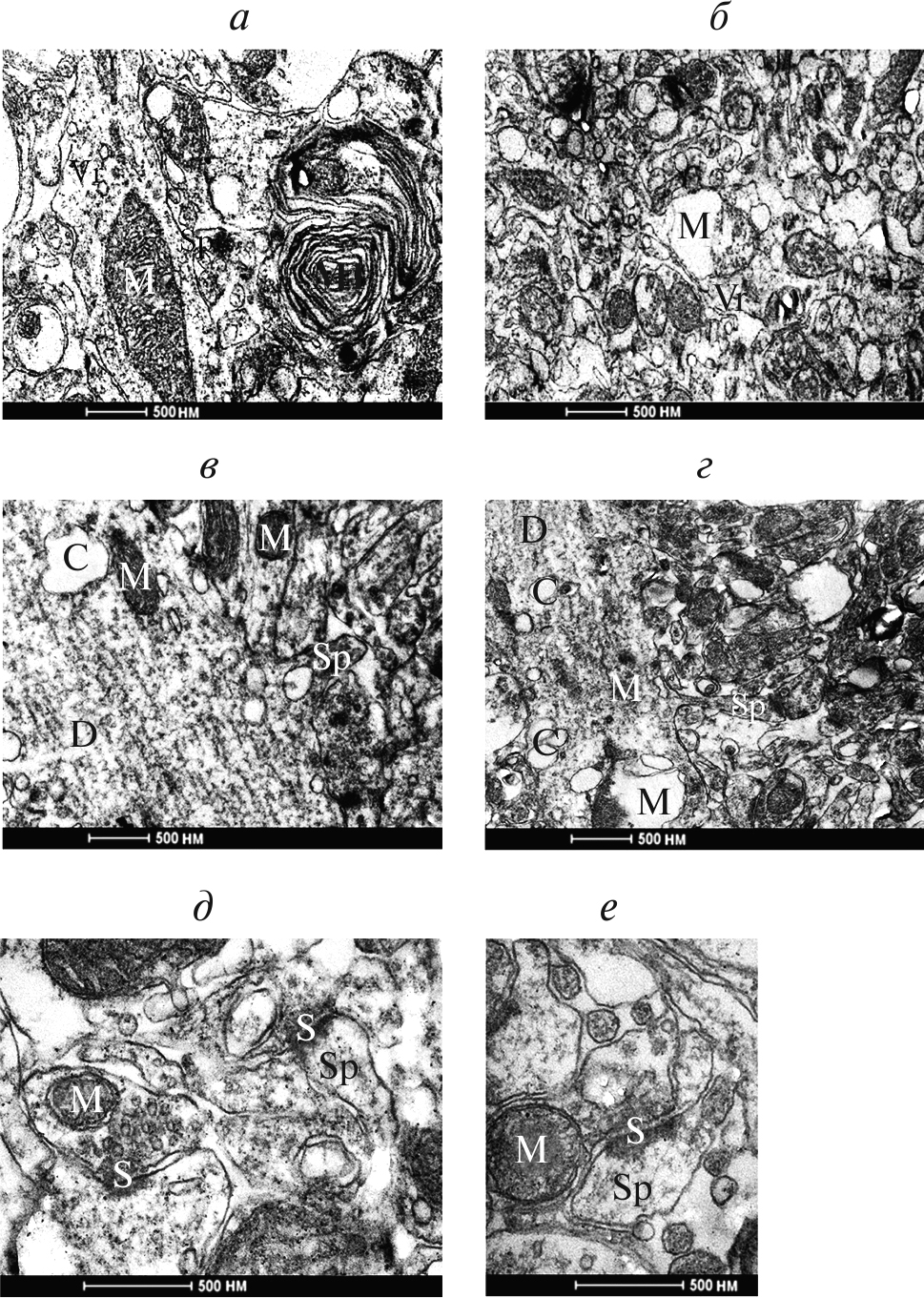 Рис. 3. Деструктивные изменения апикальных дендритов области СА1 дорсального гиппокампа. Электроннограммы крыс с пГГЦ в возрасте P90 (а–e). Ml — миелинизированные волокна, D — дендриты, M — митохондрии, Vr — варикозные расширения, С — цистерны, S — синаптические терминали с контактами, Sp — дендритные шипики