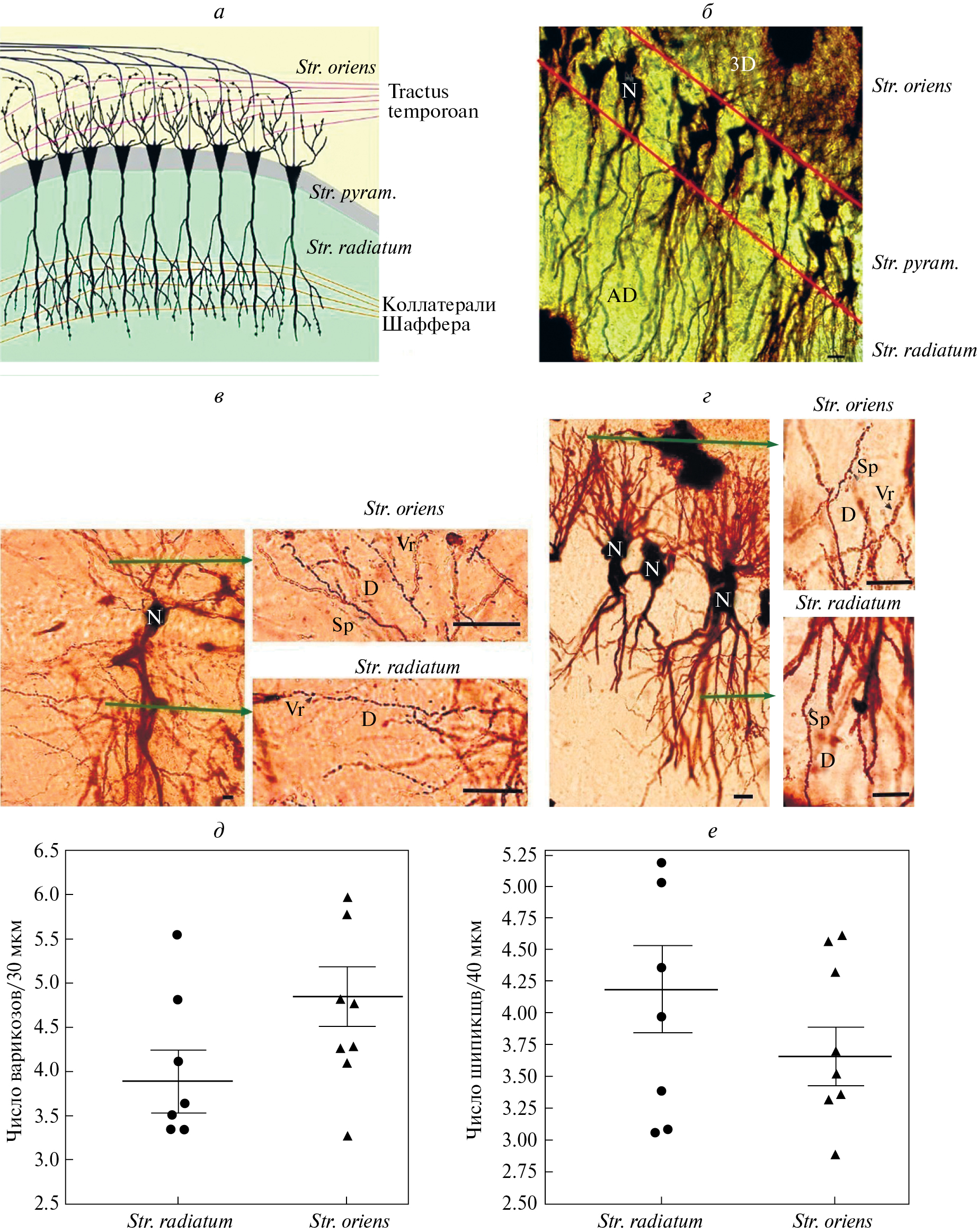 Рис. 4. Структурная организация базальных и апикальных дендритов пирамидных нейронов области СА1 дорсального гиппокампа взрослых контрольных крыс: а — схематическое изображение цитоархитектоники области СА1 дорсального гиппокампа крыс; б–г — микрофотографии области СА1 дорсального гиппокампа взрослых (P90) контрольных крыс. Метод Гольджи, масштабная линейка 10 мкм, в центре располагается слой пирамидных нейронов (Str. pyramidale); в — варикозные расширения на базальных и апикальных дендритах пирамидных нейронов; г — мощные пучки базальных и апикальных дендритов с дендритными шипиками и варикозными расширениями; д, е — количественный анализ варикозных расширений (д) и дендритных шипиков (е) на участке базальных (Str. oriens) и апикальных (Str. radiatum) дендритов пирамидных нейронов у контрольных крыс; показаны средние значения и их ошибки. Обозначения: Str. — stratum, N — нейроны, AD — апикальные дендриты, D — дендриты, BD — базальные дендриты, Vr — варикозные расширения дендритов, Sp — дендритные шипики