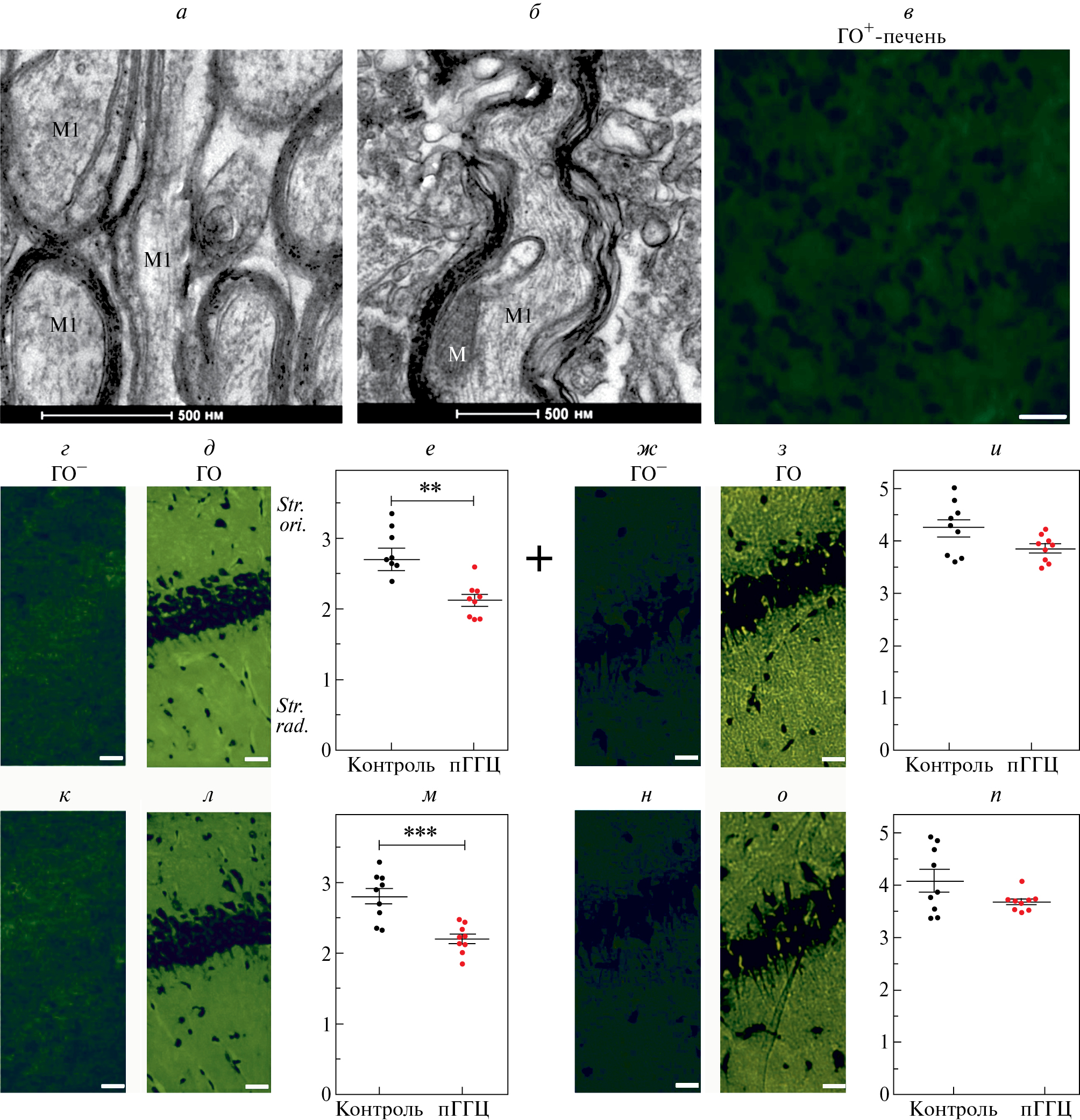 Рис. 5. Влияние пГГЦ на миелинизацию нервных волокон в поле дорсального гиппокампа крыс: электроннограммы крыс контрольных (а) и с пГГЦ (б) в возрасте P90. Ml — миелинизированные волокна, M — митохондрии; в–п — сравнение распределения гликопротеина олигодендроцитов (ГО, свечение FITC) в ткани печени (в) и области СА1 гиппокампа (г, д, ж, з, к, л, н, о) контрольных крыс (г, д, ж, з) и крыс с пГГЦ (к, л, н, о) в возрасте Р20 (г, д, к, л) и P90 (ж, з, н, о). Иммуногистохимическое окрашивание, масштабная линейка: 20 мкм; в — негативный контроль (ГО+-печень — полная иммунохимическая реакция на препарате ткани печени контрольной крысы на Р20) с первичными и вторичными антителами, масштаб: 40 мкм; г, ж, к, н — негативный контроль (ГО¯ — иммунохимическая реакция на препарате ткани гиппокампа в отсутствие первичных антител); е, и, м, п — индекс миелинизации, усл. ед. (разница в яркости свечения между исследуемым участком ткани и соответствующем ему негативным контролем ГО¯) — результаты денситометрии иммунохимического окрашивания ГО в слое stratum oriens (Str. ori.: е, и) и в слое stratum raditum (Str. rad.: м, п) у крыс на Р20 (е, м) и Р90 (и, п). Данные представлены в виде среднего и его ошибки. Звездочки показывают различия между контрольной группой и с пГГЦ на Р20 при P = 0.005 (**) и P = 0.0008 (***) (непараметрический критерий Манна–Уитни)