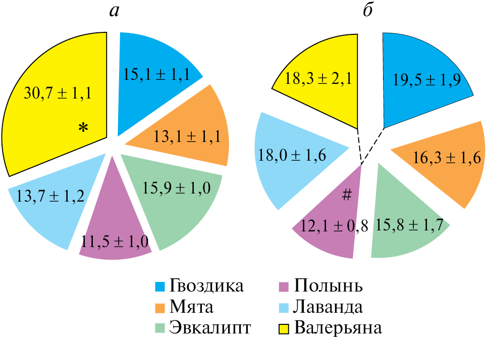 Рис. 6. Схема распределения индексов предпочтения запаха одоранта взрослыми крысами — контрольными (а) и с пГГЦ (б). Индексы представлены разноцветными секторами и выражены числом подходов (средним значением и его ошибкой) к емкости с соответствующим одорантом натурального растительного масла в процентах от общего числа подходов ко всем емкостям. Черной границей выделен сектор, соответствующий физиологически значимому запаху валерианы. Штриховые линии между секторами указывают на статистически достоверные различия индексов предпочтения между одорантами у животных с пГГЦ. Объем каждой выборки n = 15. Однофакторный анализ ANOVA с последующим анализом post hock Бонферрони. * — предпочтение запаха валерианы относительно других пяти запахов достоверно при Р < 0.0001; # — предпочтение запаха полыни относительно гвоздики, а также запаха полыни относительно валерианы достоверны при Р < 0.05