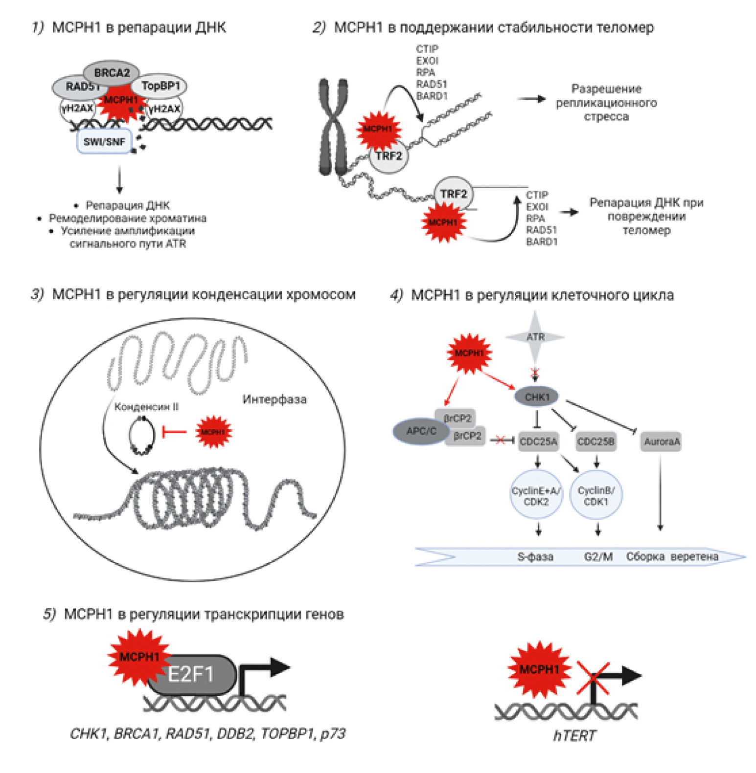 Рис. 1. Функции микроцефалина (MCPH1): 1) участвует в репарации ДНК посредством деконденсации хроматина (через комплекс SWI/SNF), привлечения факторов репарации (BRCA2 и RAD51), а также путем усиления сигнала амплификации ATR-сигнального пути за счет взаимодействия с TopBP1; 2) регулирует стабильность теломер и в случае их дисфункции привлекает факторы репарации ДНК, а также способствует разрешению репликационного стресса в теломерных районах; 3) в интерфазном ядре поддерживает трехмерную организацию хроматина путем ингибирования взаимодействие комплексов конденсина II с хроматином; контролирует клеточный цикл посредством регуляции Chk 1–Cdc 2 5b; 4) через взаимодействие с E 2F 1 активирует экспрессию белков, участвующих в репарации ДНК, контроле клеточного цикла и апоптоза; 5) репрессирует экспрессию hTERT. Красными крестами отмечены те взаимосвязи, которые оказываются нарушенным при деплеции MCPH1. Рисунок выполнен с помощью сервиса BioRender (https://biorender.com).