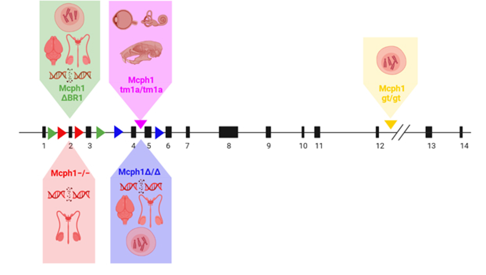 Рис. 3. Схематическое расположение мутаций и их фенотипическое проявление в трансгенных мышах с мутациями Mcph1. Треугольники, расположенные в интронах фланкируют удаленные экзоны в трансгенных линиях мышей. Треугольники над интронами указывают место интеграции кассеты для создания делеций. Рисунок выполнен с помощью сервиса BioRender (https://biorender.com).