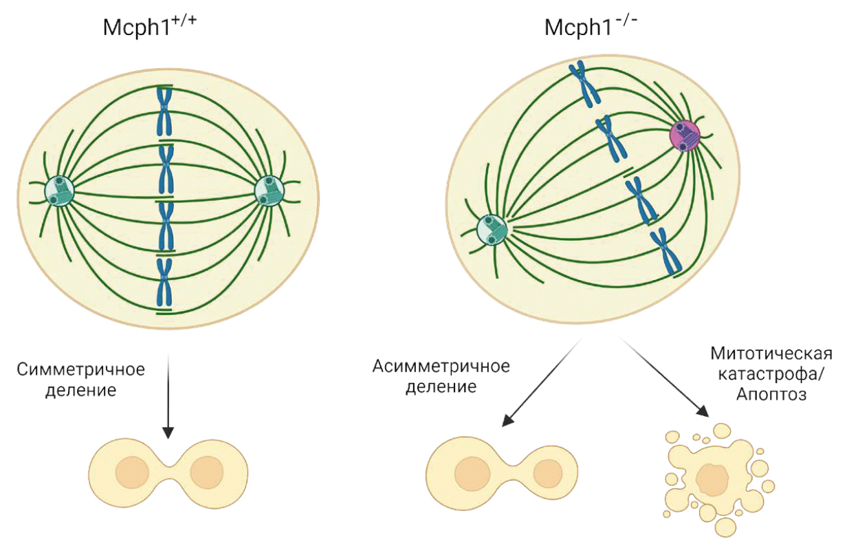 Несмотря на различную этиологию, в большинстве случаев в основе первичной микроцефалии лежат мутации в генах, связанных с архитектурой цитоскелета и клеточным делением: например, ASPM (Li et al., 2017), CDK5RAP2 (Lancaster et al., 2013), CENPJ (Gabriel et al., 2016), WDR62 (Xu et al., 2014; Zhang et al., 2019). Установлено, что дефекты веретена деления и нарушения биогенеза центросом приводят к митотической катастрофе и вызывают массовую гибель нейральных предшественников (Rauch et al., 2008; Yingling et al., 2008; Nigg, Holland, 2018). Данные о центросомальной локализации MCPH 1 и его влиянии на регуляцию биогенеза центросом противоречивы, но связывают MCPH1-опосредованную микроцефалию с другими хорошо охарактеризованными случаями первичной микроцефалии.