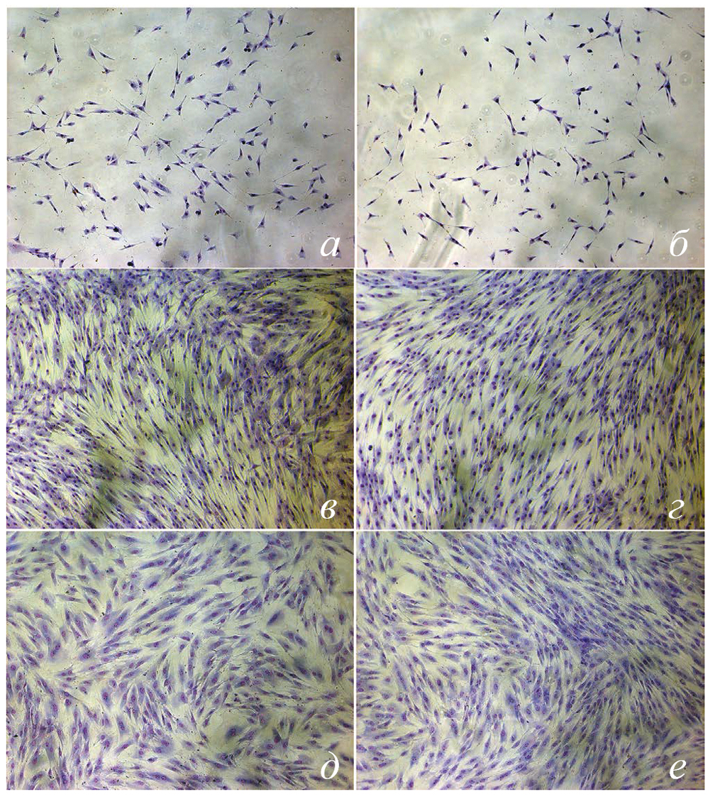 Рис. 1. Морфология МСК(ЖТ) лошади, культивируемых в обычной среде (a, в, д) и БС MesenСult (б, г, е) на 4-е сут после посева (а, б) и на пассажах 4 (в, г) и 10 (д, е). Увел: об. 10×, ок. 10×.