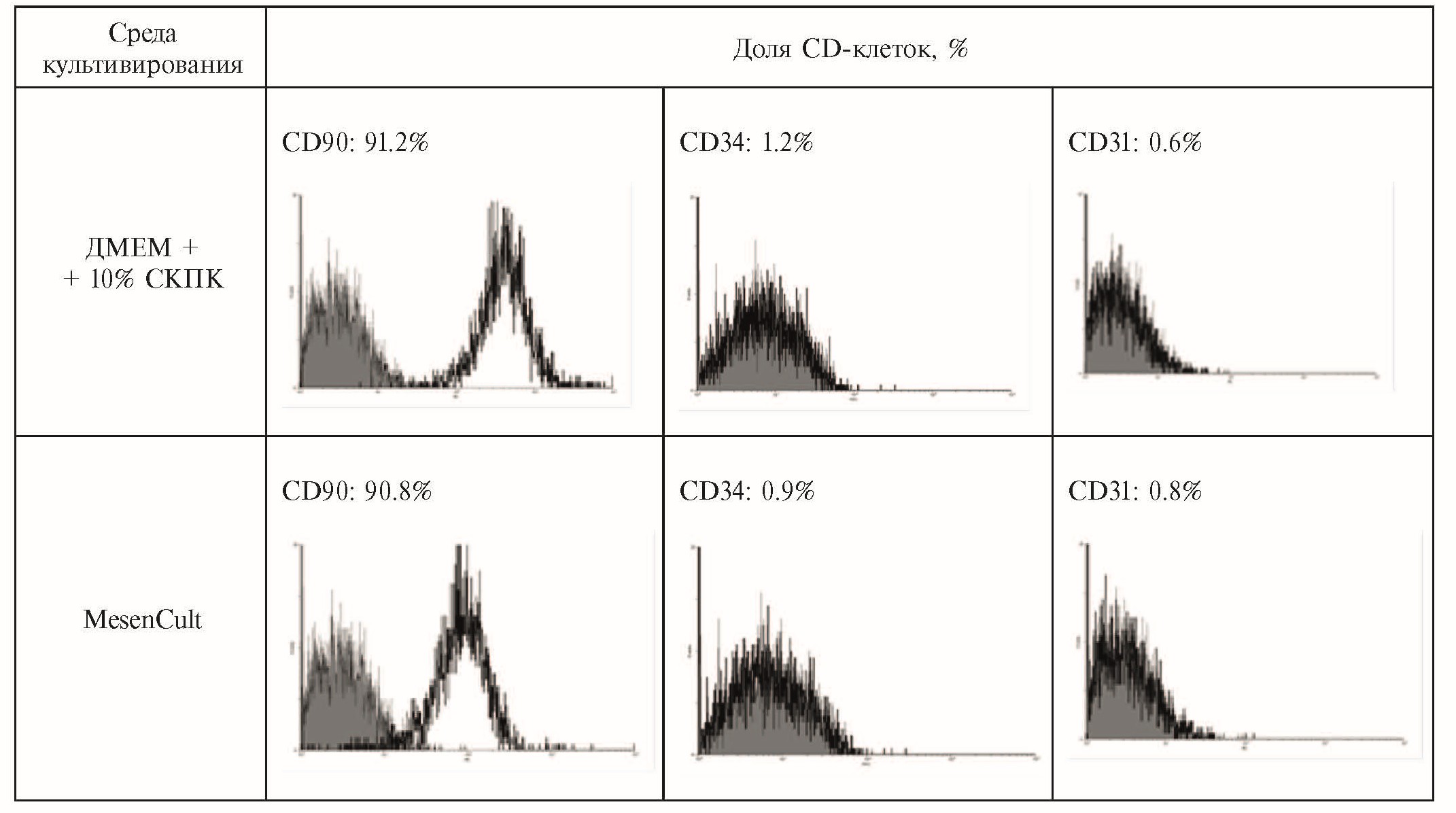 Результаты наших экспериментов показали, что МСК(ЖТ) лошади могут быть размножены в коммерчески доступной среде MesenCult, не содержащей СКПК, которая предназначена для культивирования МСК человека (www.stemcell.com). МСК сохраняли единообразную морфологию, характерную для этого типа клеток, на протяжении 10 пассажей и экспрессию гена поверхностного антигена CD90, сопоставимую с контрольной группой (P ≤ 0.01), а также при индукции были способны к дифференцировке в адипо-, остео- и хондрогенном направлениях.