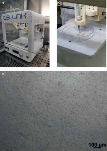 а – Экструзионный принтер Cellink Inkredible (Швеция); б – процесс биопечати; в – образец хондроцитов, напечатанный на биопринтере, световая микроскопия.