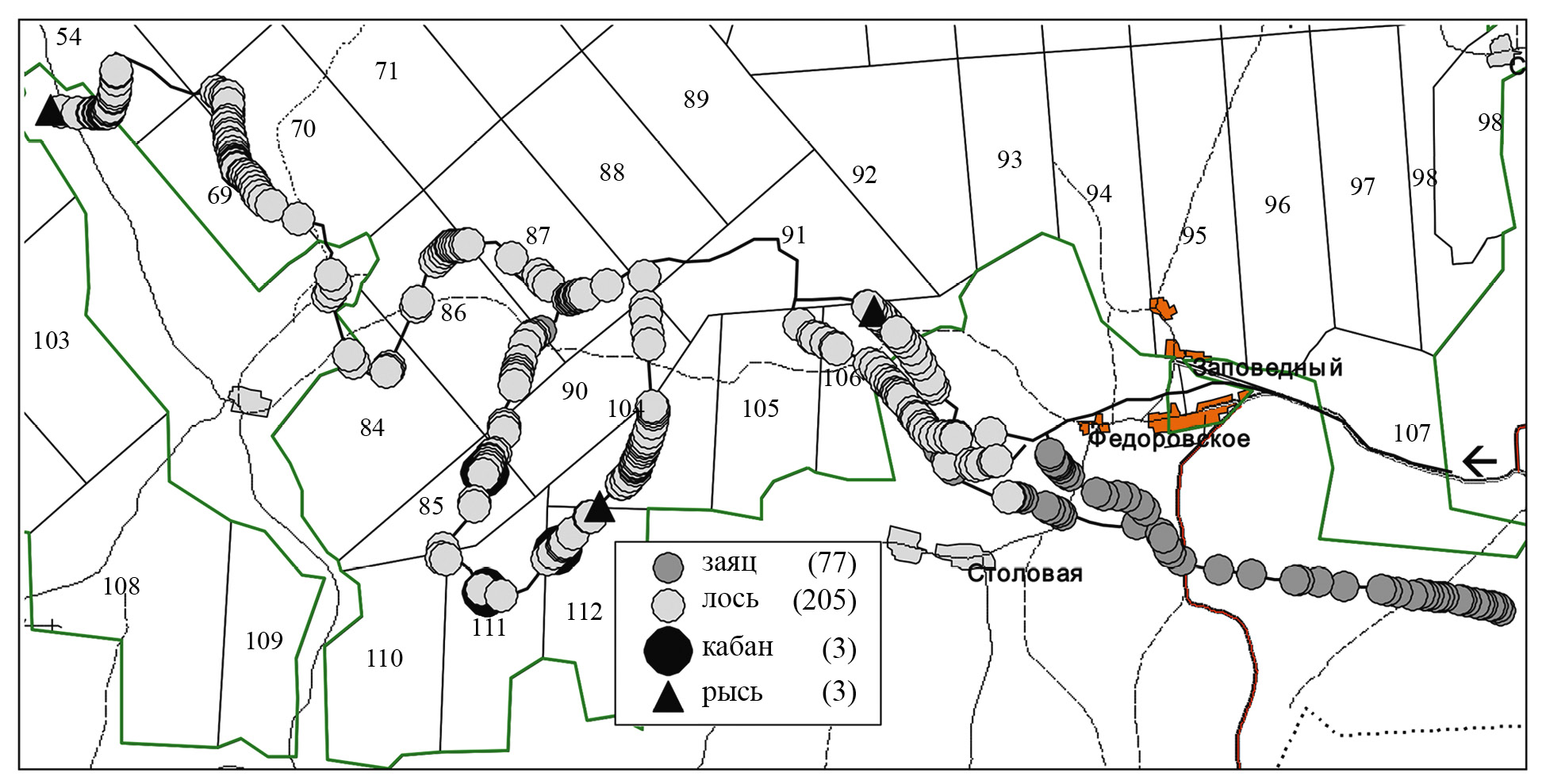 Границы территорий семей определялись по крайним точкам зарегистрированных следов конкретной семьи. Перемещения лосей на маршрутах фиксировались в течение снежного периода для понимания характера перемещений и оседлости на участках обитания в естественной среде обитания и нарушенной (вырубки, окраины деревень, полей (рис. 1)).