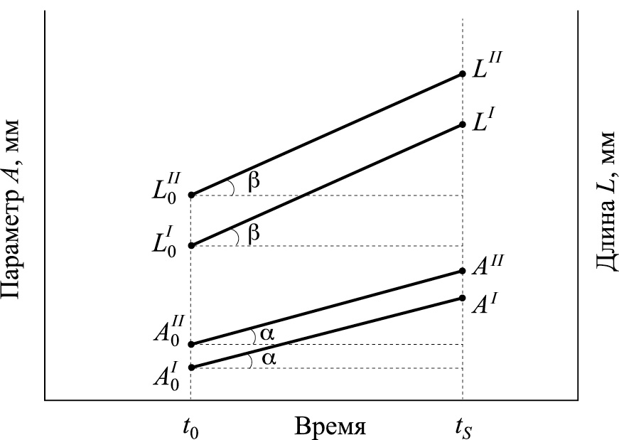 Линейный рост как самой рыбы, так и частей ее тела на разных этапах онтогенеза можно описать линейной функцией (Fortier et al., 2006; Bouchard, Fortier 2011; Vestfals et al., 2019) и функциями, отличными от линейной (Lugert et al., 2013; Thorarensen et al., 2015). Для начала рассмотрим случай линейной функции, задав параметры роста следующим образом. Пусть – время вылупления, – время взятия выборки, – величина данного пластического признака в момент вылупления , – величина этого же признака в момент , – длина тела в момент , – длина тела в момент , – скорость изменения параметра А, – скорость изменения параметра L. Тогда, если у групп I и II молоди в момент имеются статистически значимые различия по величине признака A, то есть , то они имеются вследствие следующих трех причин: разные начальные размеры, то есть , как следствие , разное время вылупления, то есть , и разная скорость роста .