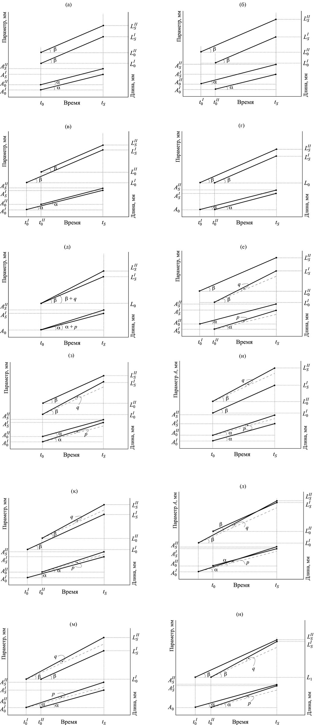 Линейная динамика величин А и L во времени при различных комбинациях равенства и/или неравенства параметров , и Gr для двух групп представлена на графиках (а–н) рис. 3. Аналогичные графики могут быть построены для любой другой функции роста, отличной от линейной.
