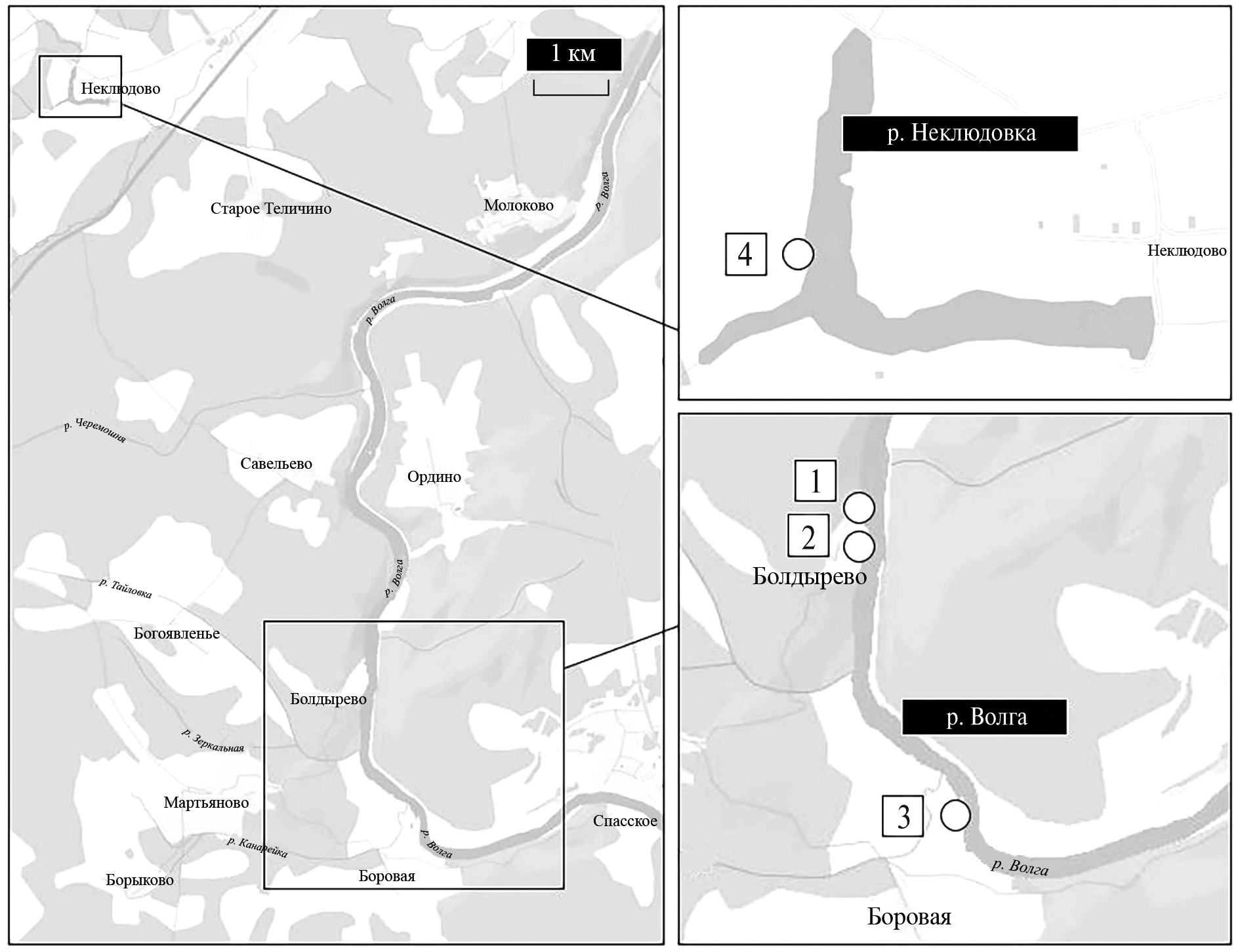 Рис. 4. Карта-схема района сбора материала, Старицкий р-н, Тверская обл.; точки 1–3 – р. Волга, левый берег, точка 4 – р. Неклюдовка.
