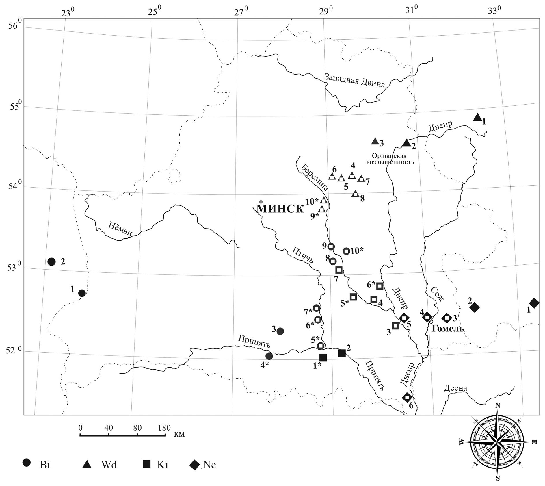 Материалом для статьи послужили данные о 512 кариотипах бурозубок из 33 выборок четырех хромосомных рас: Нерусса, Киев, Białowieża и Западная Двина в бас. р. Днепр на территории Беларуси, ранее полученные с участием авторов этой статьи (Borisov et al., 2017; Kryshchuk et al., 2021) (рис. 1).