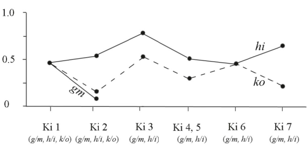 Крупный метацентрик gm встречается с частотой 0.1–0.5 по правому берегу р. Припять, но полностью исчезает на левобережье этой реки. Наиболее успешно распространяется в полиморфных популяциях метацентрик hi, его частота не опускается ниже 0.5, а частота метацентрика ko, напротив, не поднимается выше 0.5 (рис. 4). В популяциях с метацентриками расы Киев по р. Березина сохраняются акроцентрические кариотипы и отмечается избыток гетерозигот h/i и k/o (табл. 1, Ki 1, Ki 4–6).