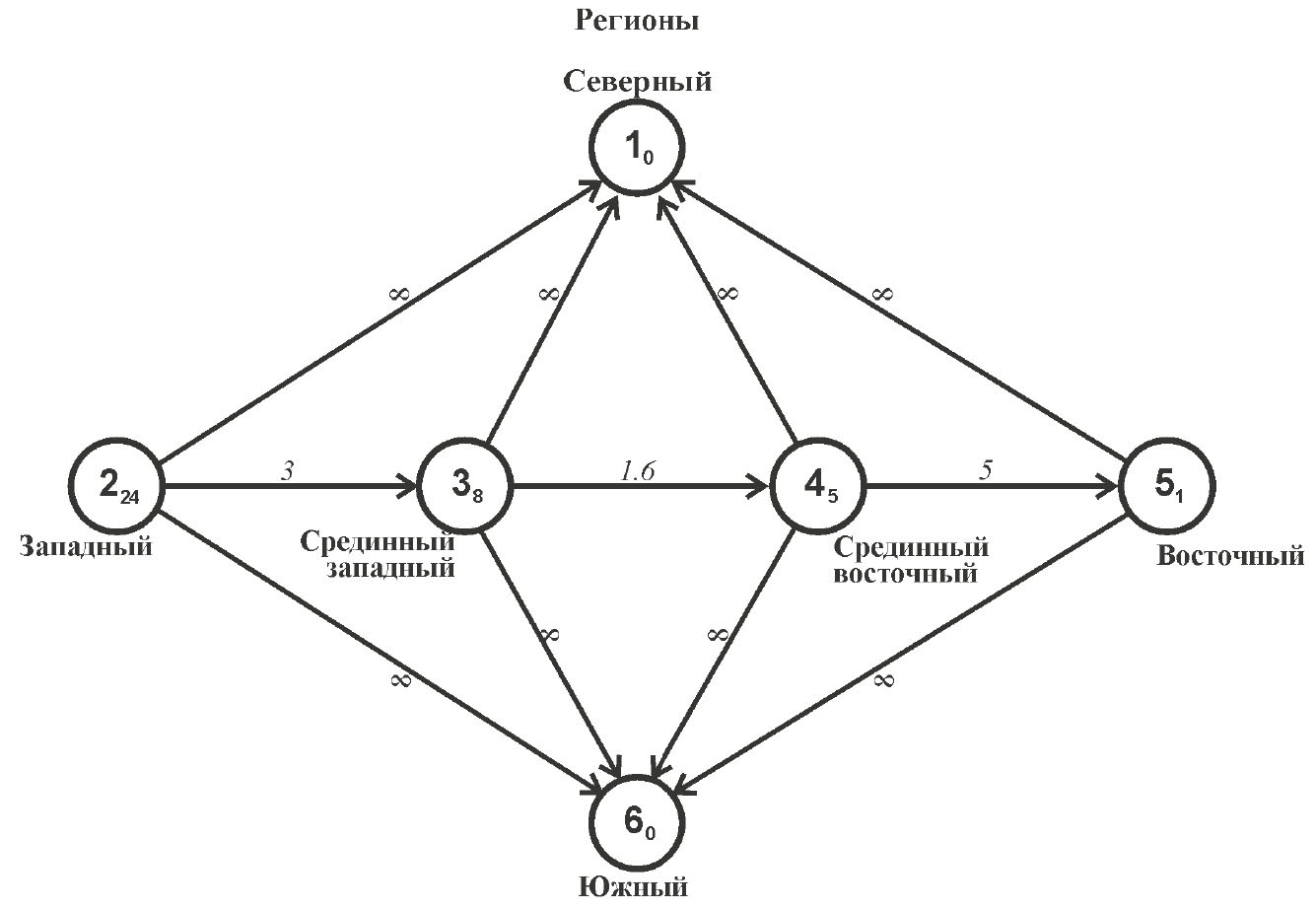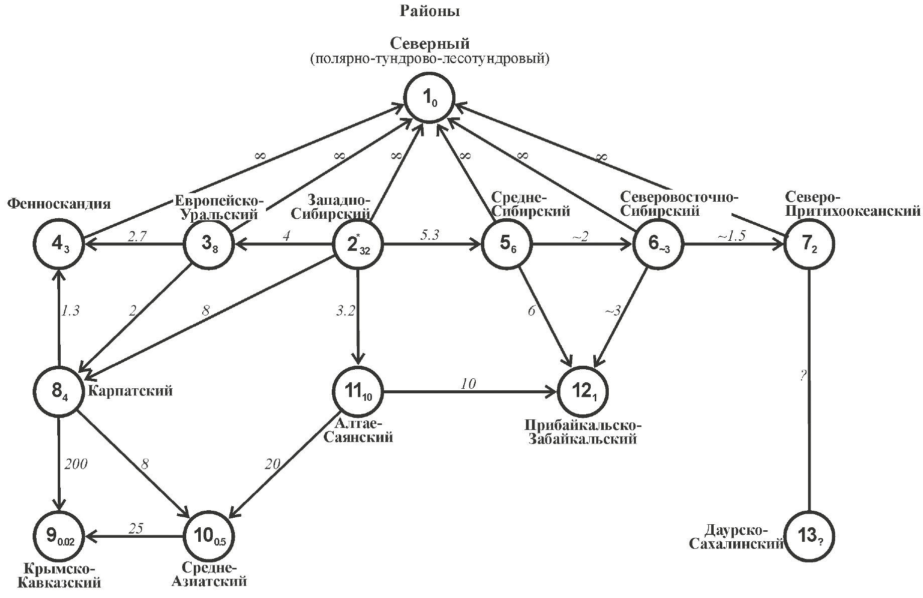Граф по зимнему обилию свиристеля представлен тринадцатью районами (рис. 5). В первый из них вошли территории полярных пустынь, тундровой и лесотундровой зон. Здесь свиристель зимой не встречен. Выше всего среднее обилие свиристеля в Западной Сибири (32 особи/км2). Далее уменьшение значений так же, как и летом, отмечено во всех направлениях по странам света, а также в горных регионах, особенно в сочетании с их более южным расположением. К западу обилие снижается в 3–4 раза, к востоку, особенно в горных ландшафтах, – в 2–5 раз. К югу в Алтае-Саянской горной стране отмечено трехкратное уменьшение, по сравнению с Западно-Сибирской равниной. В сторону Байкала оно достигает 10 раз. Особенно велико снижение значений по Крыму и Кавказу (в 200 раз) и Средней Азии (8–20 раз). Обобщенный граф включает пять районов (рис. 6). К первому и пятому (Северному и Южному) отнесены территории, где свиристель не встречен. 2–4 районы ориентированы с запада на восток, в них показатели обилия от центра (Западно-Сибирская равнина) убывают к западу и к востоку.