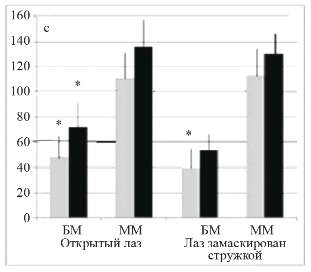 - Доли животных БМ после введения пептида, решивших тест при блокировке пробкой входа в темную комфортную часть установки, ниже, а у мышей ММ — выше, чем в контроле, но при малом размере групп эффект определяется на границе статистической значимости.