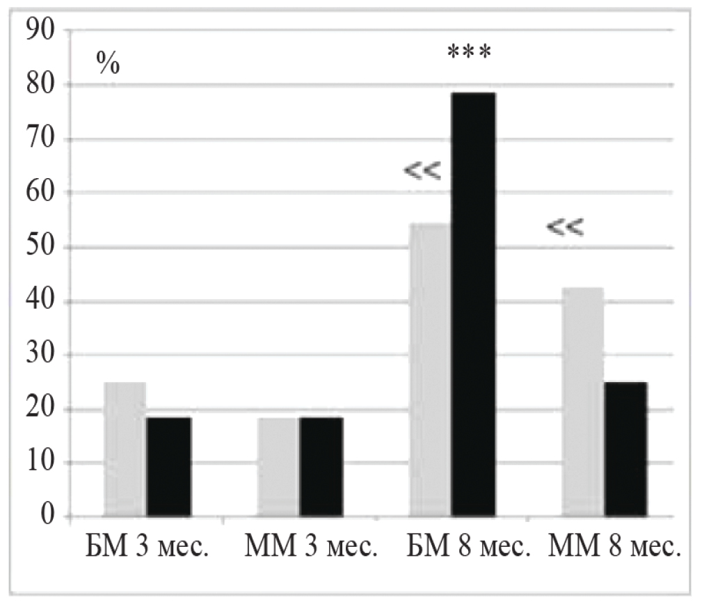 Рис. 4. Доли (%) успешных решений теста на поиск входа в укрытие у 8-месячных мышей линий БМ и ММ при лазе, закрытом пробкой (суммарно по двум предъявлениям). Данные представлены в виде средних. Серые столбики — введение дипептида, черные столбики — контроль (введение физиологического раствора); *** — значимое (р < 0.001) отличие от такой же группы линии ММ; << — различия между группой после дипептида и контрольной группой приближаются к достоверности (метод φ по Фишеру, t = 1.8 и t =1.83, тогда как p < 0.05 при t = 2.0).