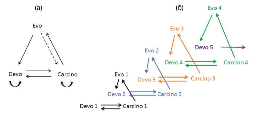 Рис. 1. Диаграммы сarcino-evo-devo, которые показывают коэволюцию индивидуального и неопластического развития (a) и четыре последовательных шага прогрессивной эволюции с промежуточной формой Carcino (б).