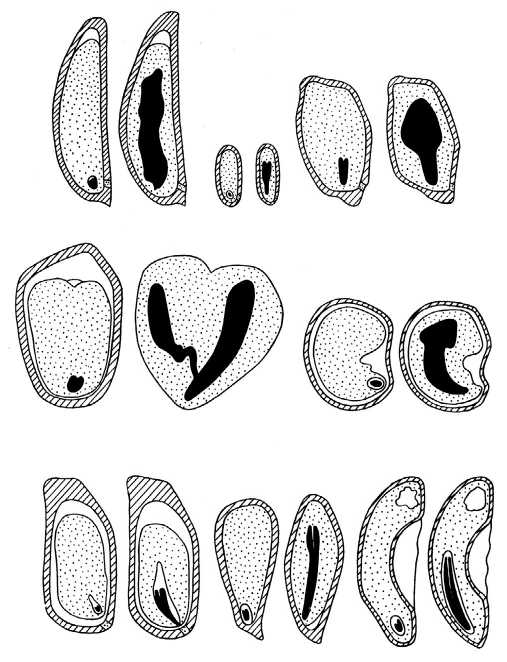 Рис. 5. Попарное сравнение семян различных цветковых растений в момент опадания с материнского растения (каждый левый рисунок в паре) и накануне прорастания (правый рисунок в каждой паре). По: Грушвицкому, 1961, с изменениями.