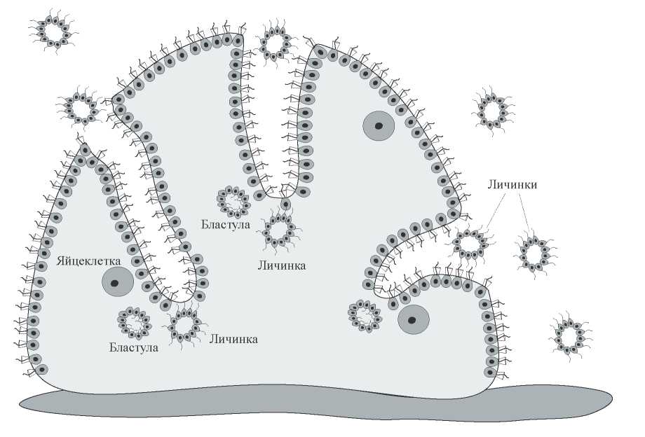 Отправной точкой для рассуждений в области эволюционной эмбриологии животных, несомненно, является вопрос об их исходном способе развития. Подробнейшие дискуссии на эту тему могут быть найдены, например, у Ёжикова (1940), Захваткина (1949), Ивановой-Казас (1975, 1995), Малахова с соавт. (2019). К настоящему времени доминирующей в литературе и хорошо подтвержденной многочисленными фактами представляется гипотеза о первичности индивидуального развития с метаморфозом. При таком развитии взрослому организму предшествует сильно отличающаяся от него личиночная стадия. Наиболее архаичным вариантом такой стадии считается синзооспора — нераспавшийся на отдельные клетки (споры) продукт палинтомического деления зиготы (Захваткин, 1949). Синзооспора не способна к самостоятельному питанию и играет роль расселительной стадии (рис. 7).