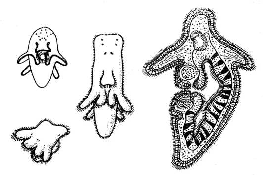 Большого разнообразия и сложности достигают примеры эмбрионизации среди плоских червей (Plathelmintes s.s.) (Иванова-Казас, 1975; Martín-Durán, Egger, 2012). Парафилетическая группа Archoorophora, к которой относятся монофилетические таксоны Catenulida, Macrostomorpha и Polycladida, характеризуется обычным для животных накоплением желтка в ооците и формированием крупной яйцеклетки. После внутреннего оплодотворения происходит откладка яиц во внешнюю среду. У большинства видов развитие полностью эмбрионизировано и протекает без личиночных стадий. Однако у некоторых представителей Polycladida имеет место вторичная дезэмбрионизация, в результате которой из яйца выходит так называемая мюллеровская личинка (рис. 9), ведущая планктонный образ жизни. Последующее развитие такой личинки протекает без резкого метаморфоза, сопровождаясь постепенным ростом и трансформацией личиночных органов в имагинальные (Иванова-Казас, 1975).