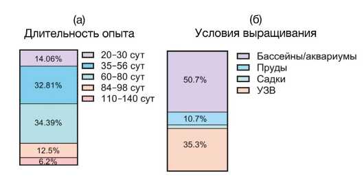 Рыбоводно-биологические показатели | Начальная, конечная масса; относительная, абсолютная скорость роста; выживаемость; кормовой коэффициент/конверсия корма и др. |