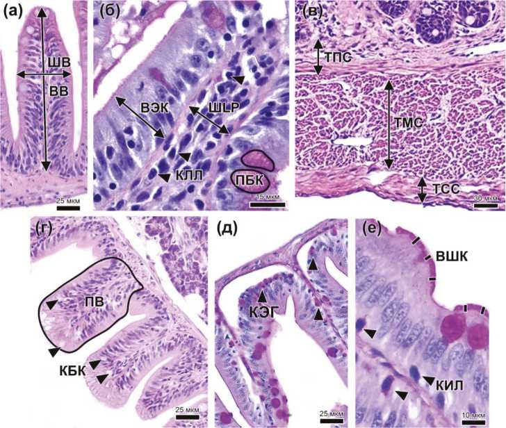 Гистологические показатели являются важным критерием в оценке кормовых добавок, так как могут предоставить данные о влиянии испытуемых компонентов на пищеварение и метаболизм. Применение гистологических методов при изучении кормов и кормовых добавок выражается в оценке ряда качественных морфологических показателей ткани, отражающих частное действие пробиотика и не дающих полного представления о его эффективности (Buddington et al., 1997). При этом в гистологической практике распространен способ оценки морфологических изменений ткани с помощью балльной (полуколичественной) модели (Bernet et al., 1999) либо с помощью морфометрических измерений (количественно) (Oropesa et al., 2013; Lai et al., 2014; Hamidian et al., 2017). Второй способ оценки представляется более объективным, так как дает возможность применить к полученным данным статистические методы обработки, а также сравнить полученные результаты с другими авторами. Морфометрия или стереометрия в гистологии представляет собой метод измерения различных тканевых и клеточных структур (Elias, Hyde, 1980). Гистоморфометрия нашла широкое применение в гистопатологии, где сравнение различных размерных характеристик гистологических структур позволяет судить о степени выраженности и распространенности патологии и более точно ее классифицировать (viz. атрофия, гипотрофия). Подробности применения морфометрии в ихтиопатологии, водной токсикологии и экотоксикологии отражено в разных публикациях (Rašković et al., 2016; Barišić et al., 2018).