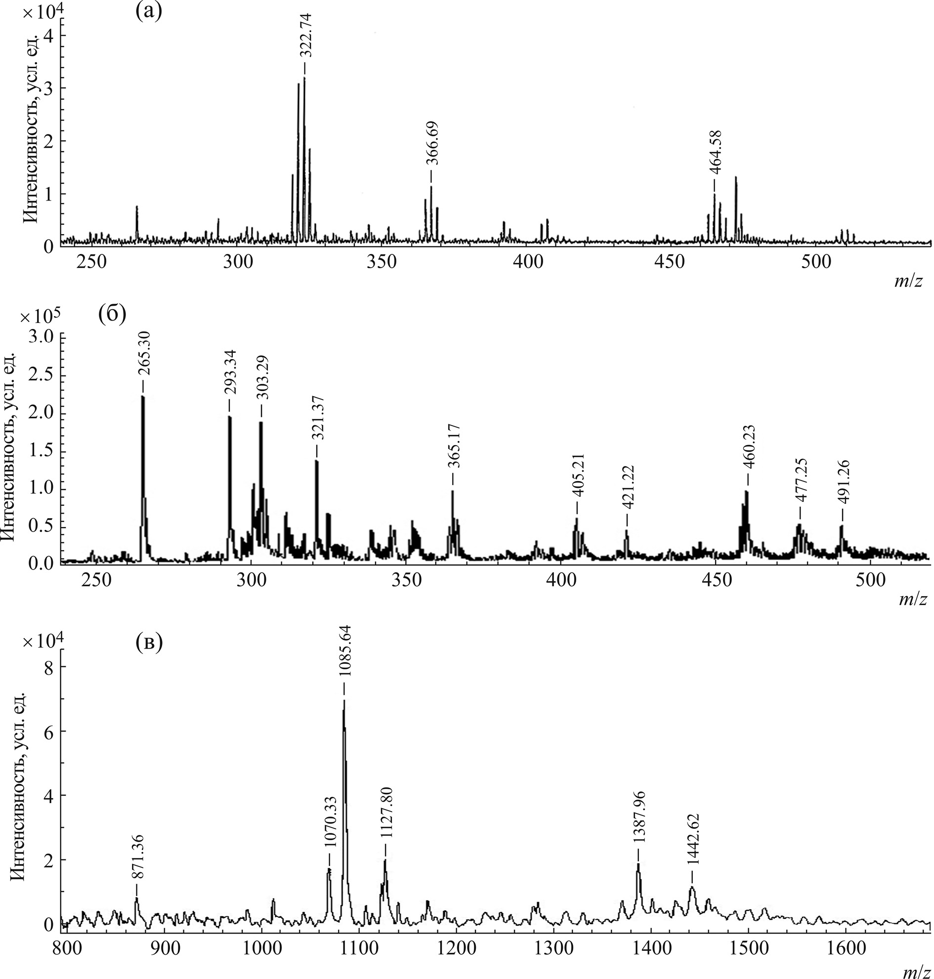 В настоящей работе рассматриваются и сравниваются данные молекулярных масс, расположенные по оси Х. Величина пика иона по оси Y (интенсивность) определяется относительным количеством иона в образце.