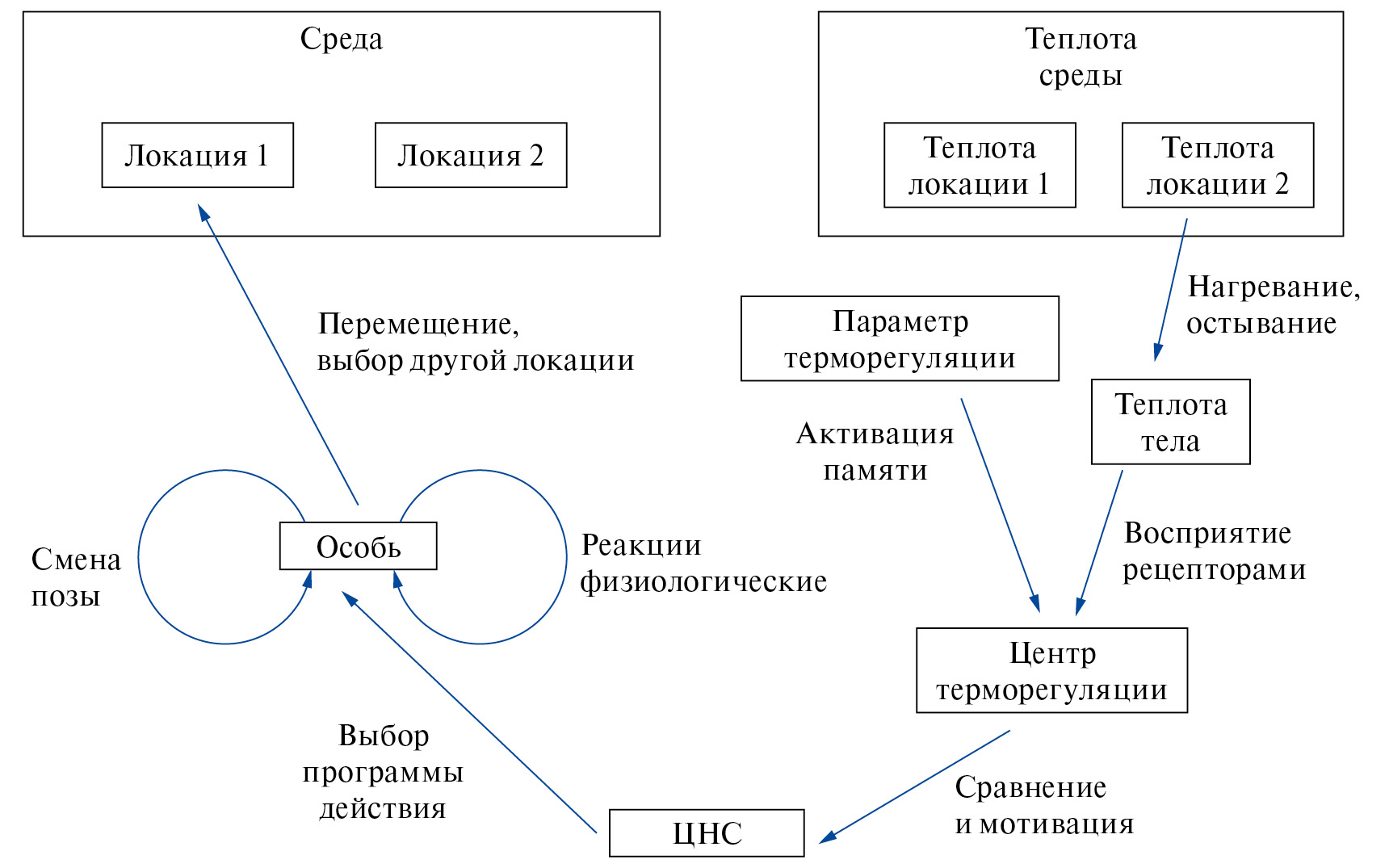 Рис. 1. Система понятий терморегуляция рептилий на примере реакции избегания перегрева; блоки соответствуют материальным объектам, стрелки обозначают процессы.