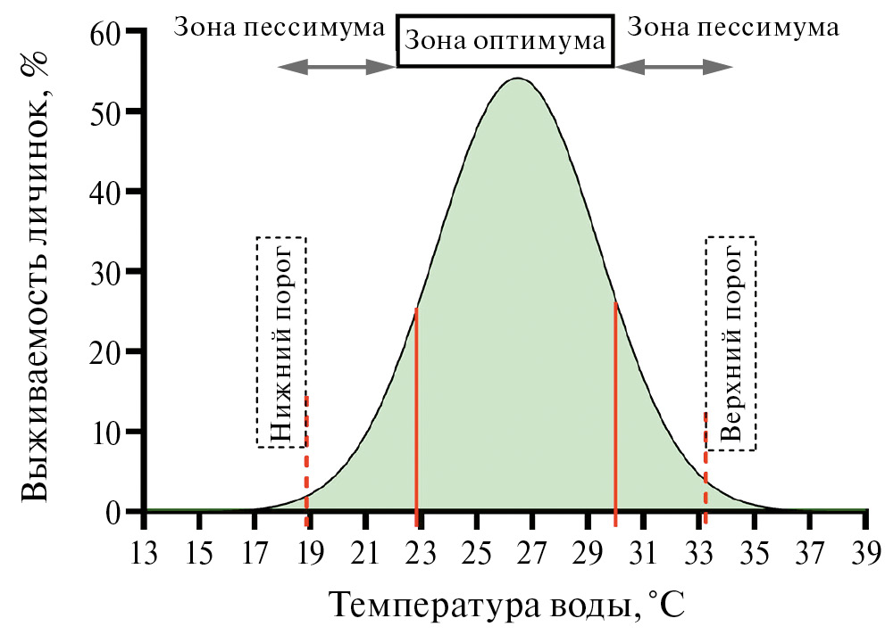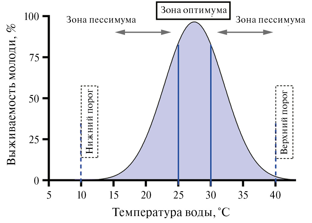 Рис. 4. Оптимальный и пессимальный термальные диапазоны для личинок C. gariepinus (Hoffman et al., 1991; Prokešová et al., 2015).