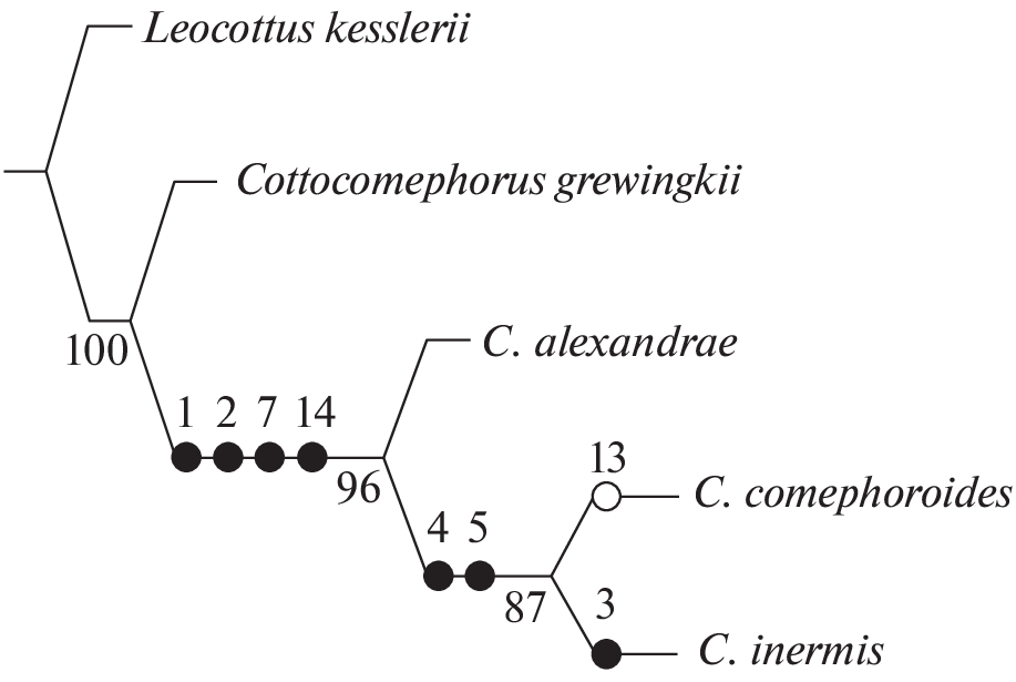 Comparative morphological studies of type and identified specimens of four species of genus Cottocomephorus Pellegrin, 1900 confirmed the presence of morphological differentiation between species of this genus (C. grewingkii, C. alexandrae, C. comephoroides, and C. inermis). Morphological similarity of the species was reconstructed using cladistic analysis. Two main clades were identified, of which the basal position was occupied by the clade C. grewingkii. Another clade includes three species (C. alexandrae, C. comephoroides, and C. inermis). For species identification, we created a table with the most significant diagnostic features.