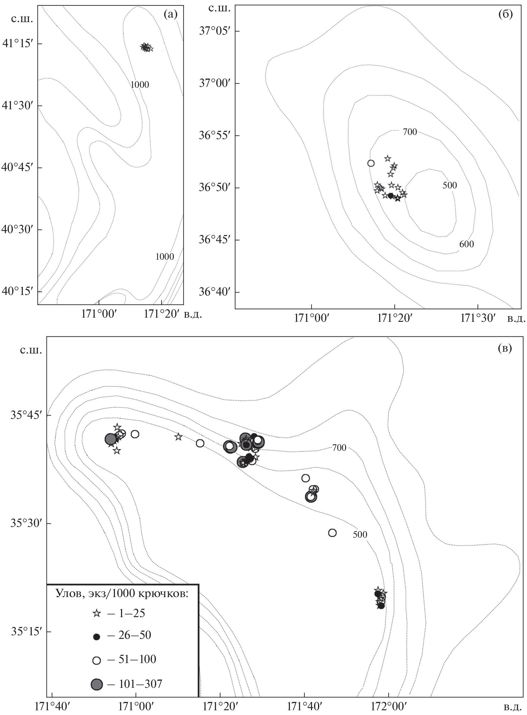 Based on the materials collected in the course of longline fishing in the area of the Emperor Seamount Chain, new data on the occurrence, distribution, and some features of the biology and ecology of Hozukius guyotensis have been presented. It has been shown that it is a common species in the ichthyofauna of the studied area. It is observed on the peaks and in the slope area of the Nintoku, Lira, and Koko seamounts at depths of 385–1015 m; its largest catches are typical for the range of 500–700 m. In the catches, H. guyotensis was represented by individuals 32–73 cm long and weighing 0.45–5.27 kg. Presumably, the species begins to mature at a length of 44–46 cm; the main stage of its reproduction takes place in spring.