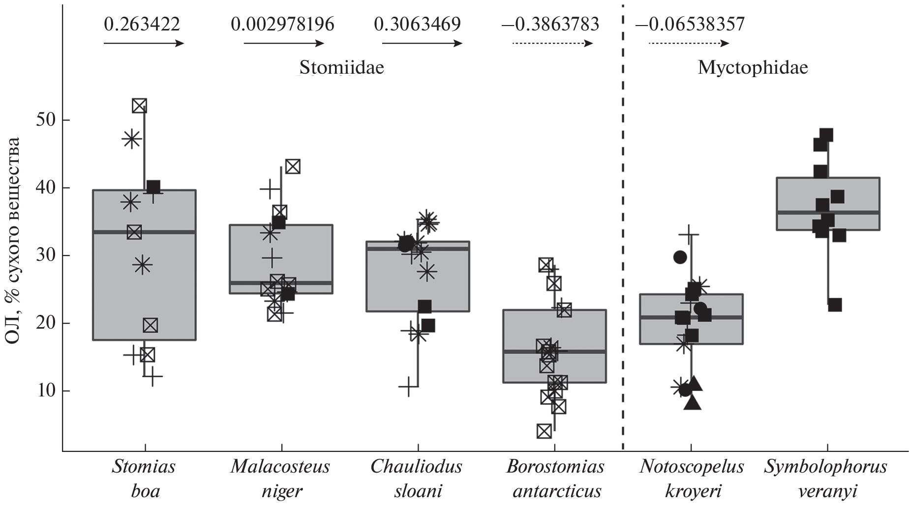 - Özdemir N.S., Parrish C.C., Parzanini C., Mercier A. 2019. Neutral and polar lipid fatty acids in five families of demersal and pelagic fish from the deep Northwest Atlantic // ICES J. Mar. Sci. V. 76. № 6. P. 1807–1815. https://doi.org/10.1093/icesjms/fsz054