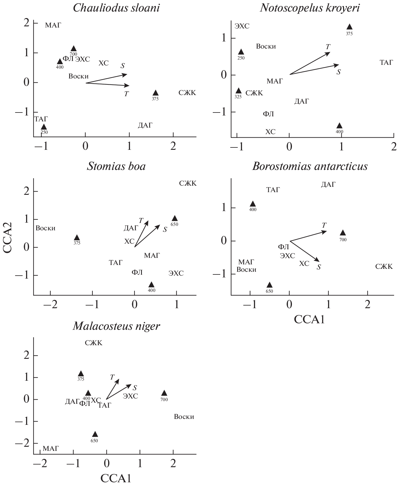 - Voronin V.P., Artemenkov D.V., Orlov A.M., Murzina S.A. 2022. Lipids and fatty acids in some mesopelagic fish species: general characteristics and peculiarities of adaptive response to deep-water habitat // J. Mar. Sci. Eng. V. 10. № 7. Article 949. https://doi.org/10.3390/jmse10070949