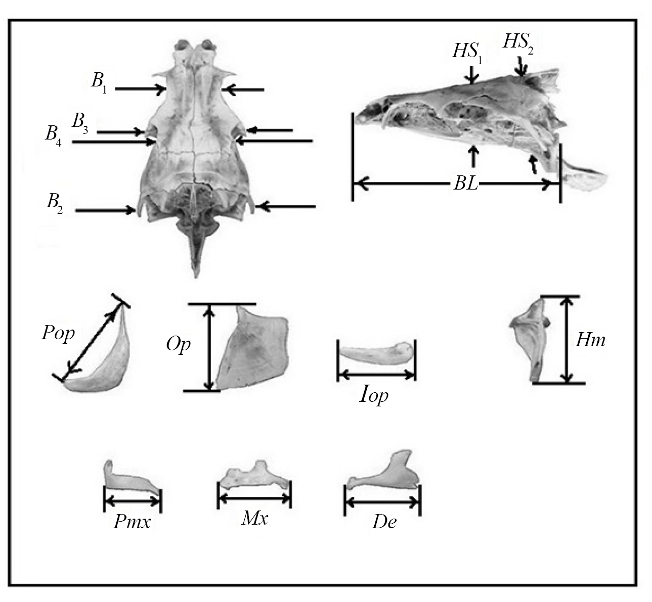 Рис. 1. Схема промеров черепа усачей комплекса Barbus intermedius. Параметры осевого черепа: BL – базальная длина черепа; HS1, HS2 – высота черепа на уровне соответственно изгиба parasphenoideum и заднего края parasphenoideum; B1, B2, B3 – расстояние между внешними краями соответственно frontalia, pterotica и sphenotica; B4 – ширина черепа на уровне соединения frontale и pteroticum. Параметры висцерального черепа: Hm – высота hyomandibulare, Pop – длина praeoperculum, Op – высота передней части operculum; Iop, Pmx, Mx, De – длина соответственно interoperculum, praemaxillare, maxillare и dentale.